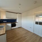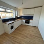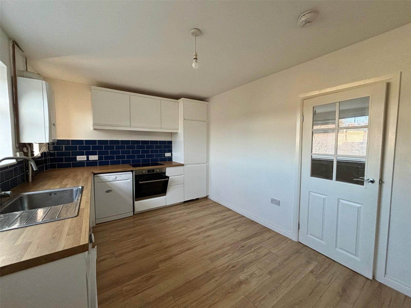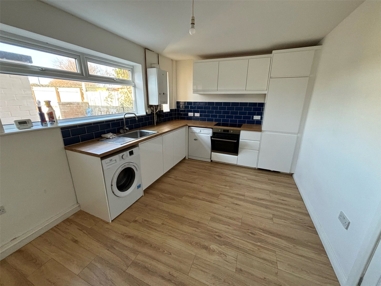 UPVC double glazed window to rear of property, laminate flooring, radiator, white base units with matching counter tops, stainless steel sink with tap, oven and hob with extractor fan.