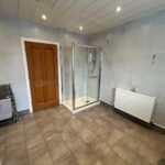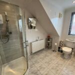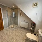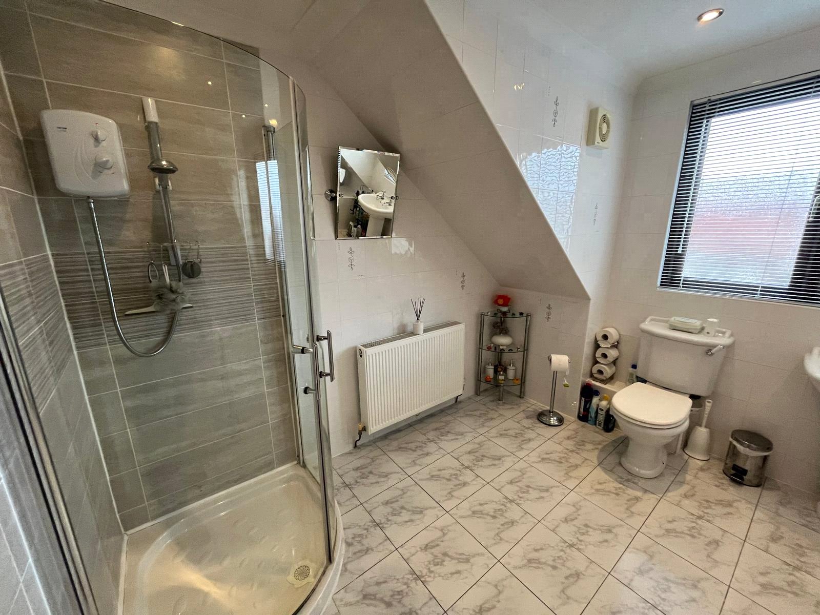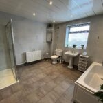 Double-glazed window, panelled bath, shoer cubicle with electric shower, w/c, hand basin, fully tiled walls, tiled flooring, radiator, spotlights.