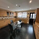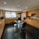 Double-glazed window and door to rear garden, full range of fitted base and wall units including display cabinets, integrated washing machine, integrated dishwasher, integrated dryer, integrated full-height fridge, 2 electric ovens, gas hob, stainless-steel sink, tiled flooring, tiled splashback, radiator, spotlights.