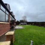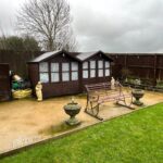 Gravelled and lawned areas, patio with 2 playhouses/sheds, overlooking fields.