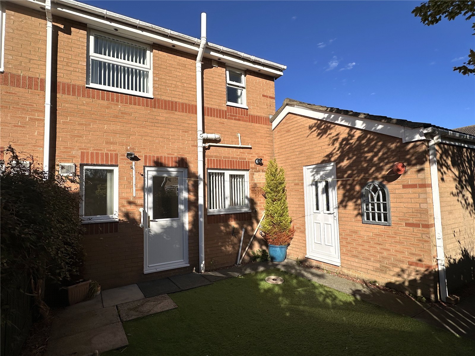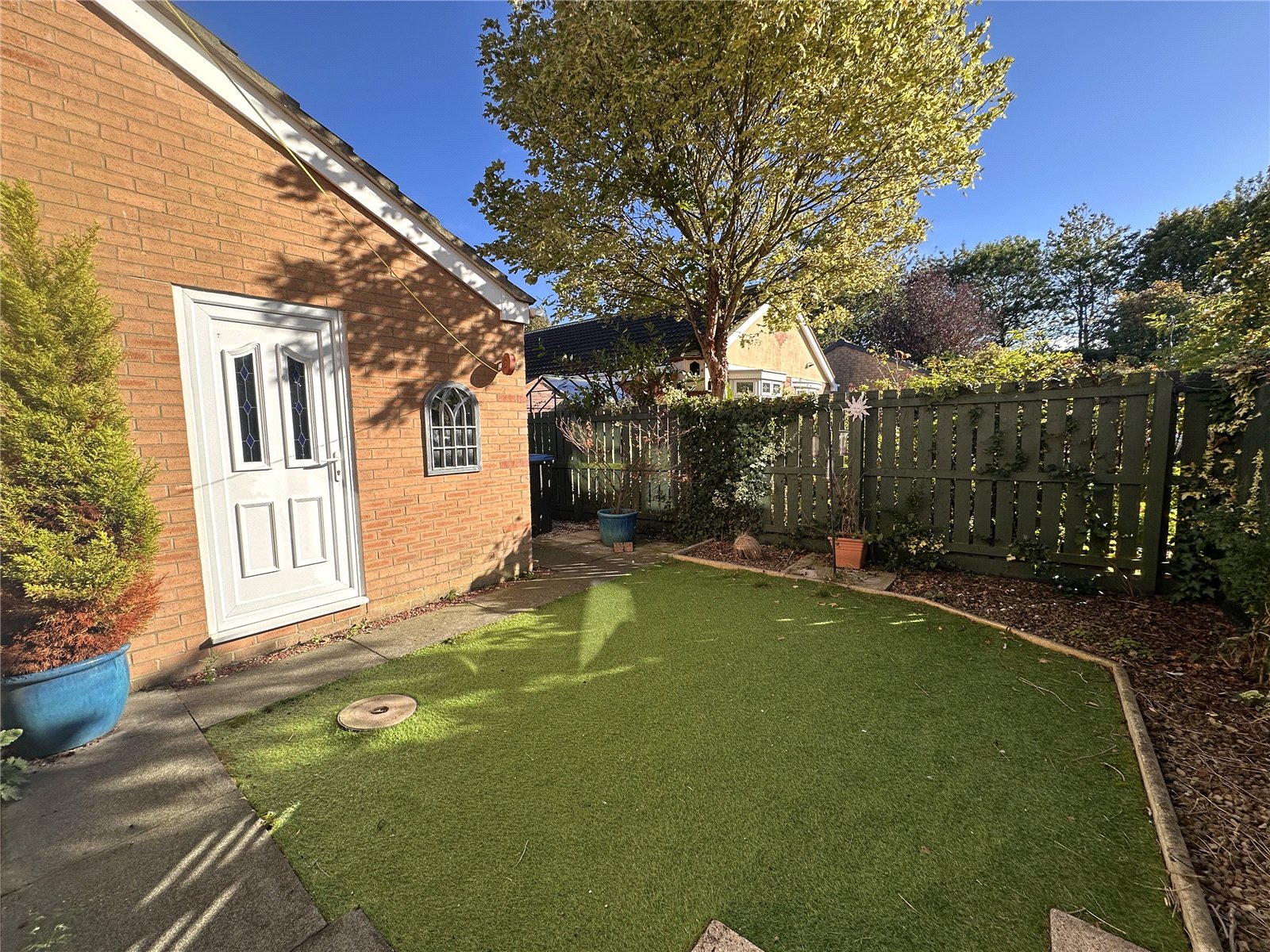 To the front of the property there is a with conifers, drive way providing access to the garage. To the rear there is a secluded garden with artificial lawn with established plants and shrubs.