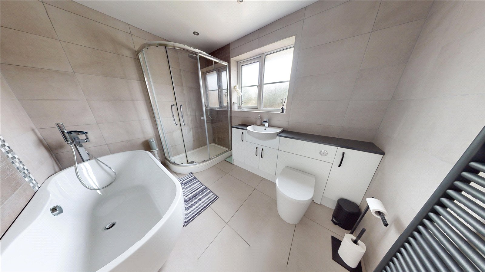 tiled bathroom suite with freestanding shower, freestanding bath, a rang of units, wash hand basin, wc and radiator