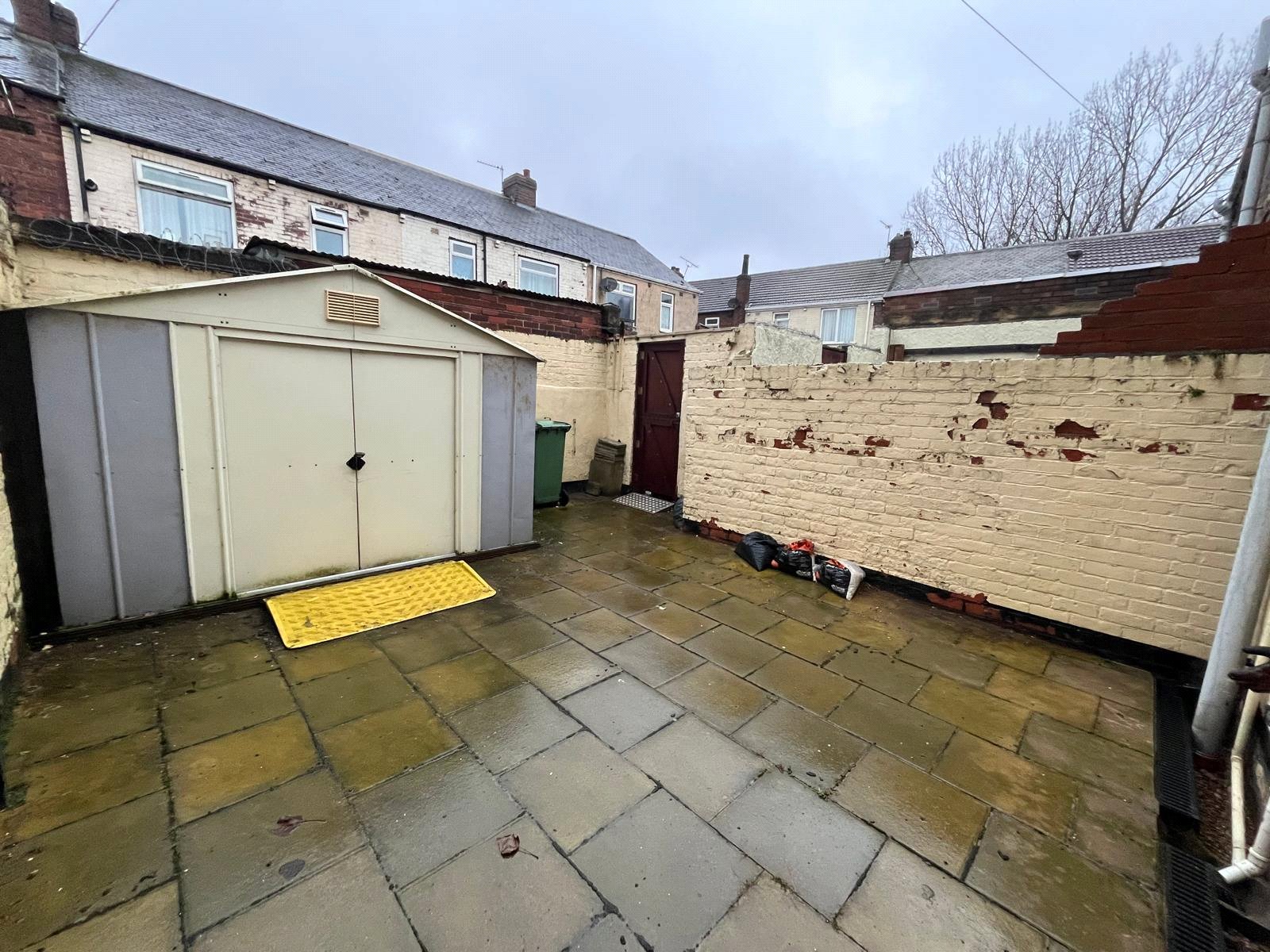 Walled yard to rear with double-door storage shed.