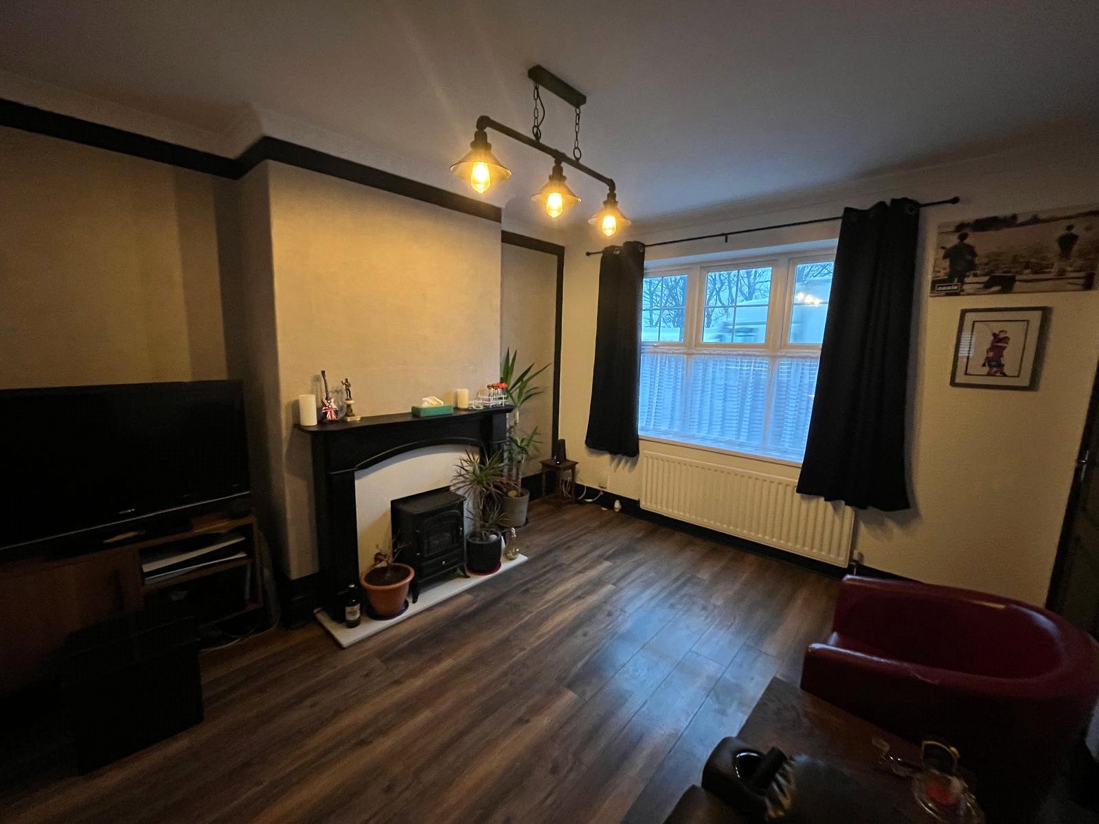 Double-glazed window, feature fire-breast with inset electric fire, timber surround and marble hearth, laminate flooring.