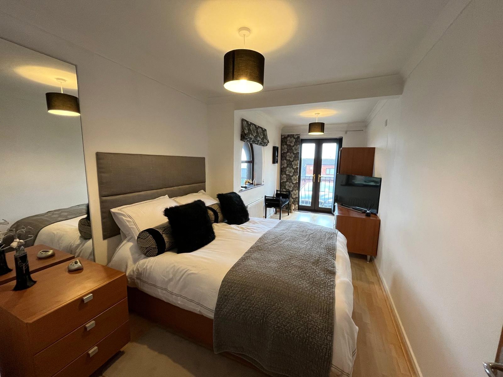 Double-glazed arched window, French doors with Juliet balcony, laminate flooring, radiator.