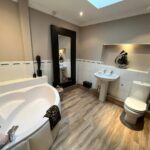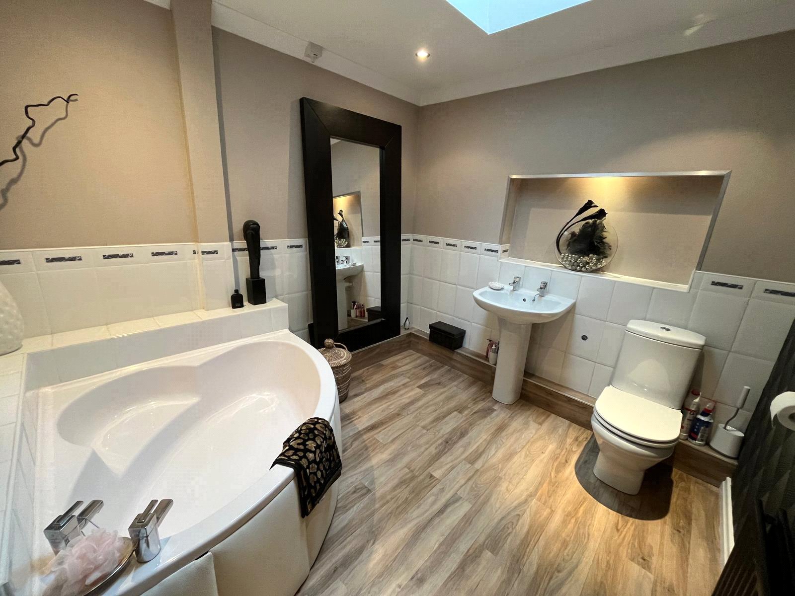 Velux window, panelled corner bath, w/c, hand basin, half tiled walls, laminate flooring, radiator, spotlights.