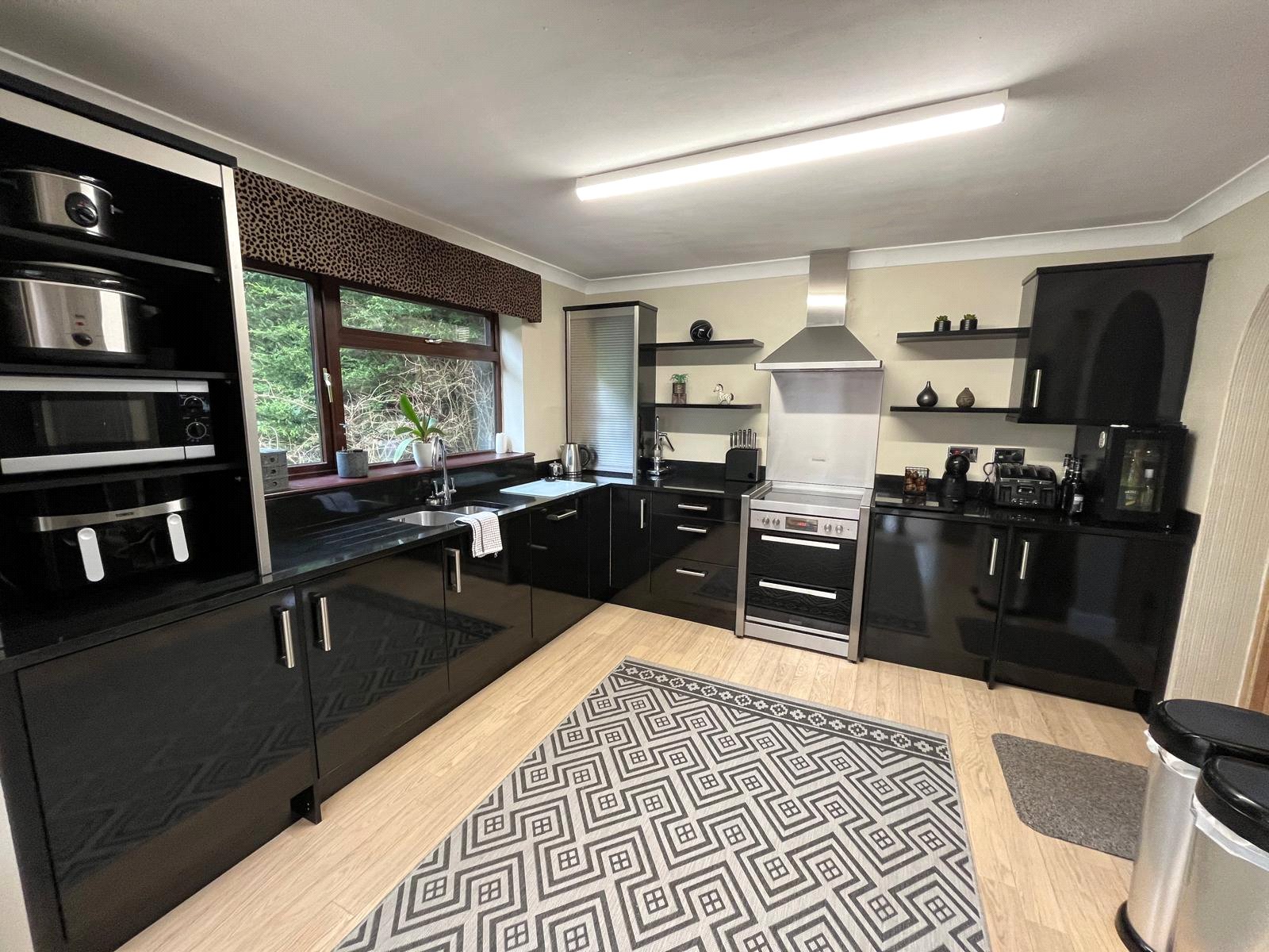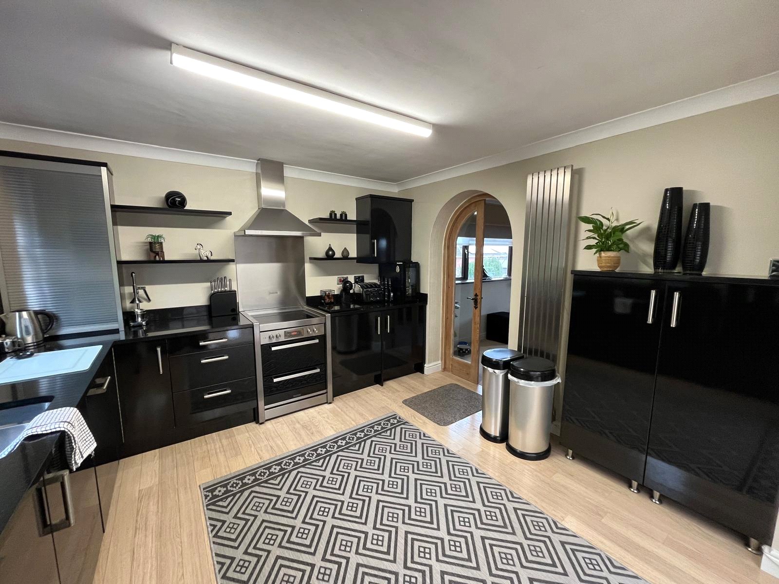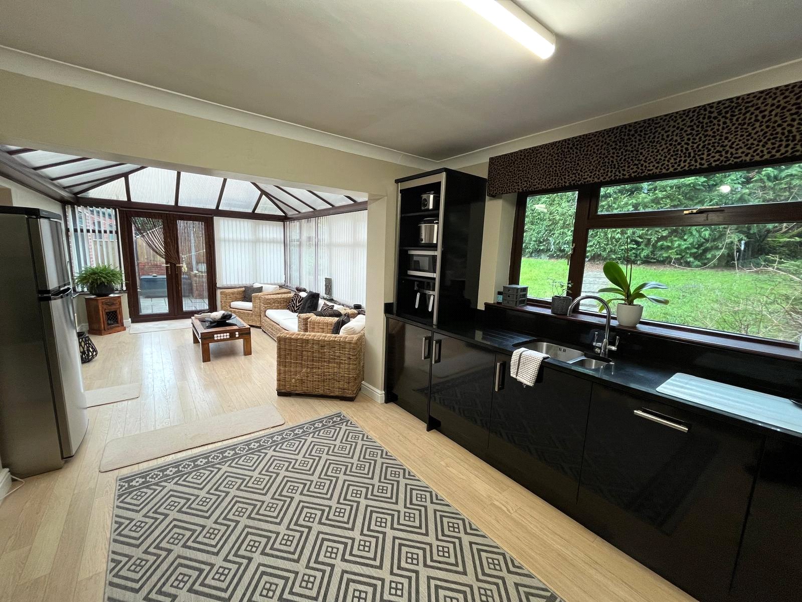 Double-glazed window, full range of base and wall units including display cabinets, granite work surfaces, under mounted stainless-steel sink, integrated washing machine, integrated dishwasher, integrated fridge, integrated freezer, double electric oven with ceramic hob, stainless steel splash back, extractor, laminate flooring, arch through to conservatory.