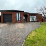 Double width block paved driveway with parking for 2-3 cars, lawned with planted area.