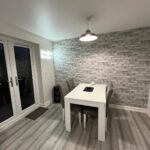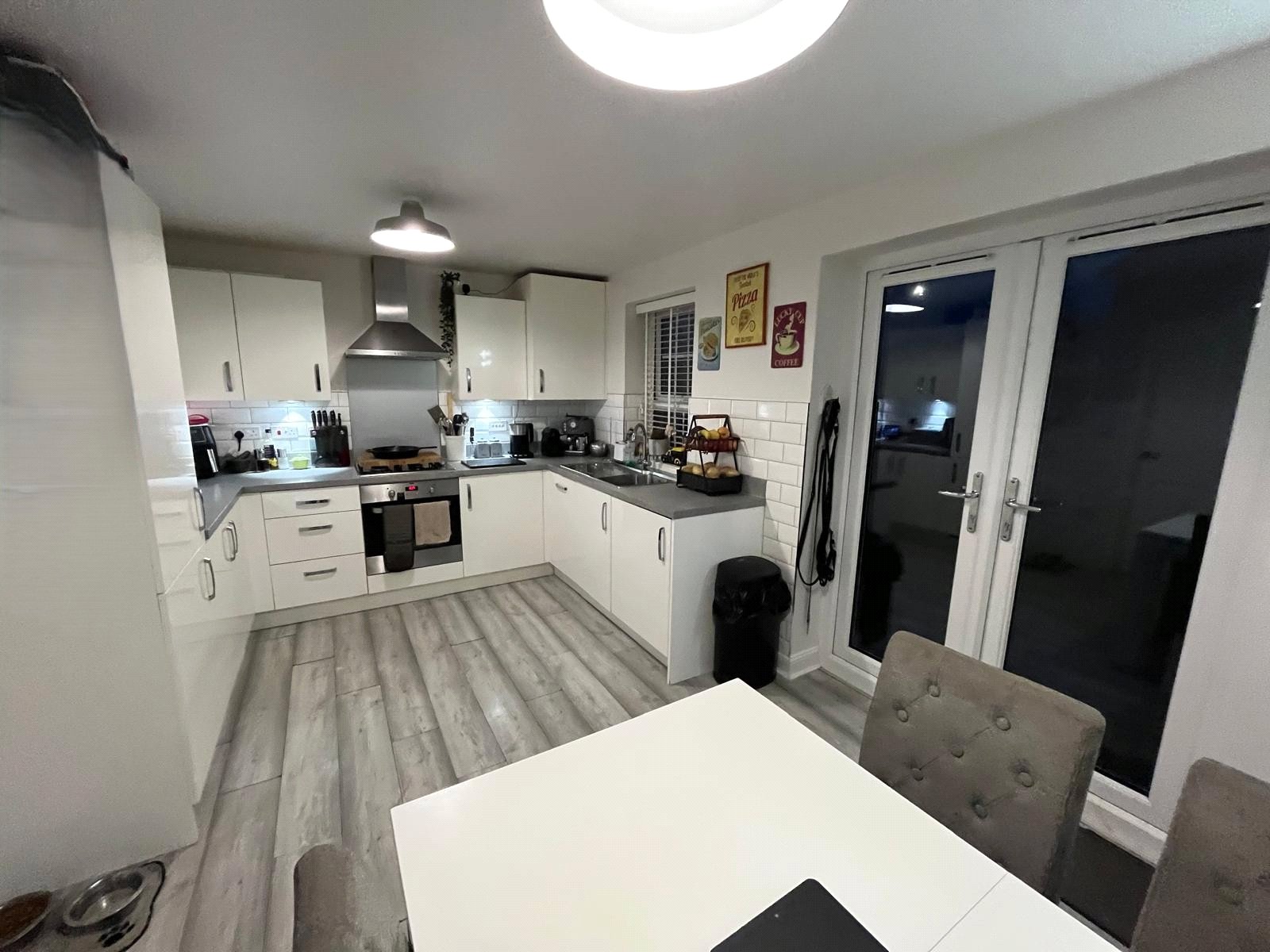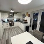 Double-glazed windows with louver blinds, Full range of wall and base units, Stainless steel sink unit, Gas boiler (housed in unit), Tiled splashbacks, Laminate floor, French doors leading to rear garden, Electric oven, Gas hob, Extractor, Integrated washer/dryer, Integrated 70/30 fridge/ freezer, Integrated slimline dishwasher. (All appliance Zanussi).
