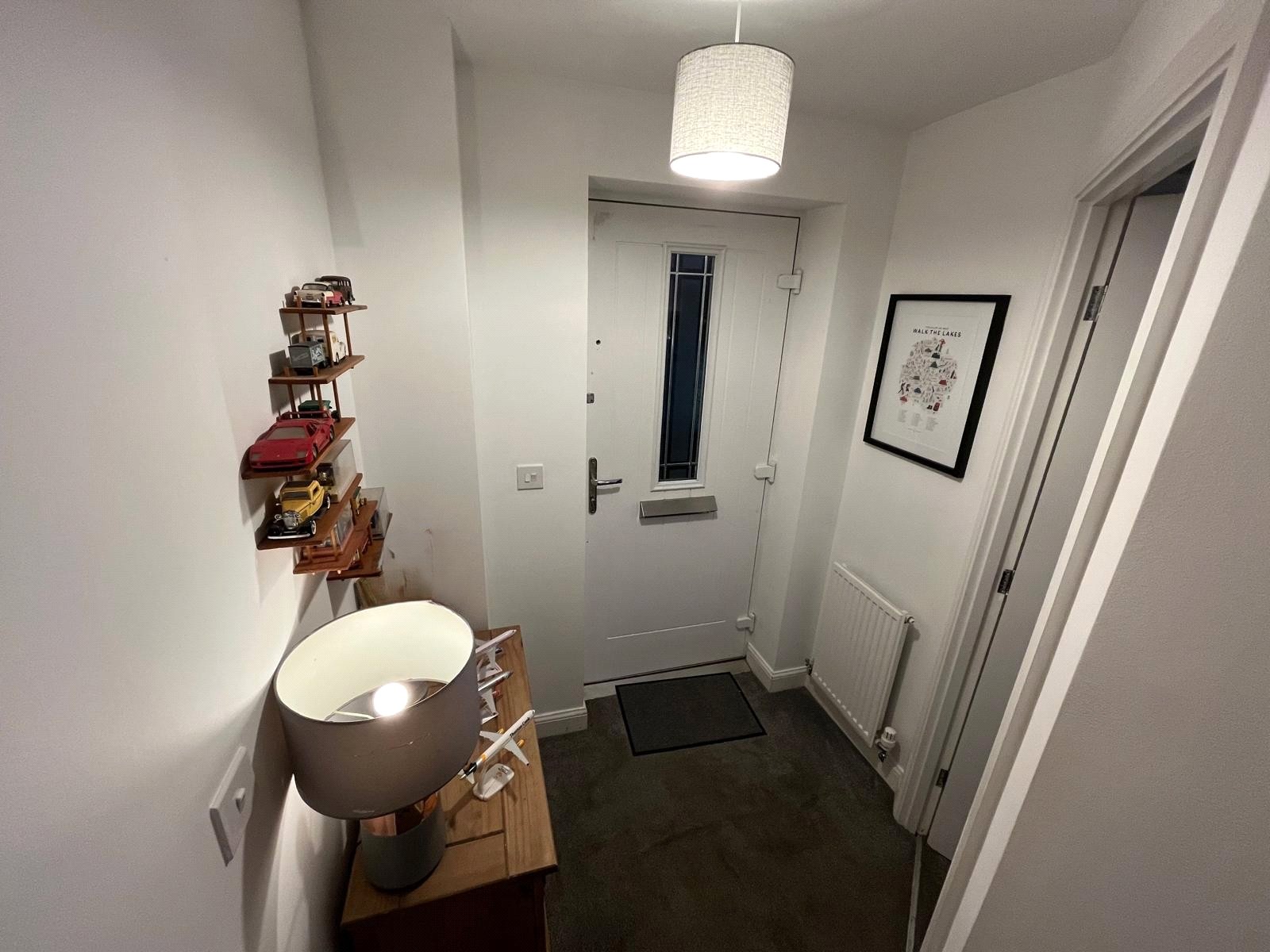 Composite double-glazed entrance door, carpeted, Radiator, Leading to stairs and living room