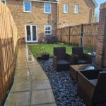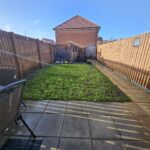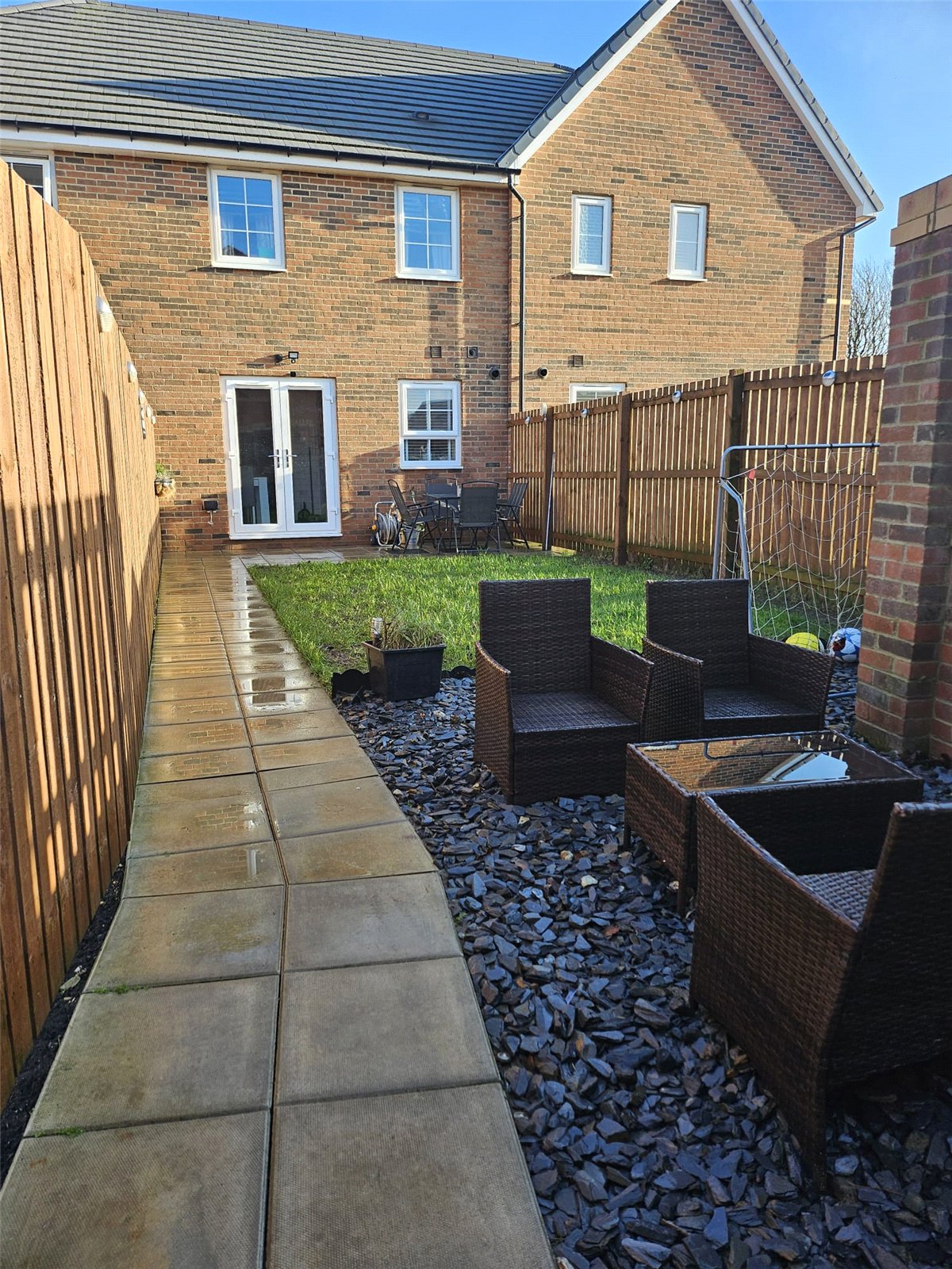 Paved patio and lawned areas, gate to private parking for 2 cars.