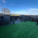 Large decking area with astro turf, paved area, shed, gate leading to field at rear.