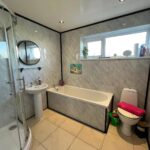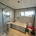 Double-glazed window, panelled bath, w/c, hand basin, shower cubicle with bar shower, tiled floor, panelled walls and ceiling, spotlights, chrome ladder towel warmer.
