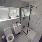 Fully tiled bathroom suite with wc, wash hand basin with storage, shower, double glazed window, heated towel rail