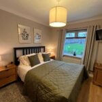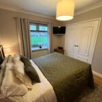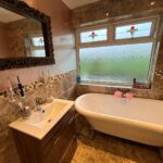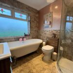 Double-glazed window, free-standing double ended bath, shower cubicle with bar shower, drawer vanity hand basin unit, w/c with concealed cistern, tiled flooring, fully tiled walls, tall ladder towel warmer, extractor, spotlights.