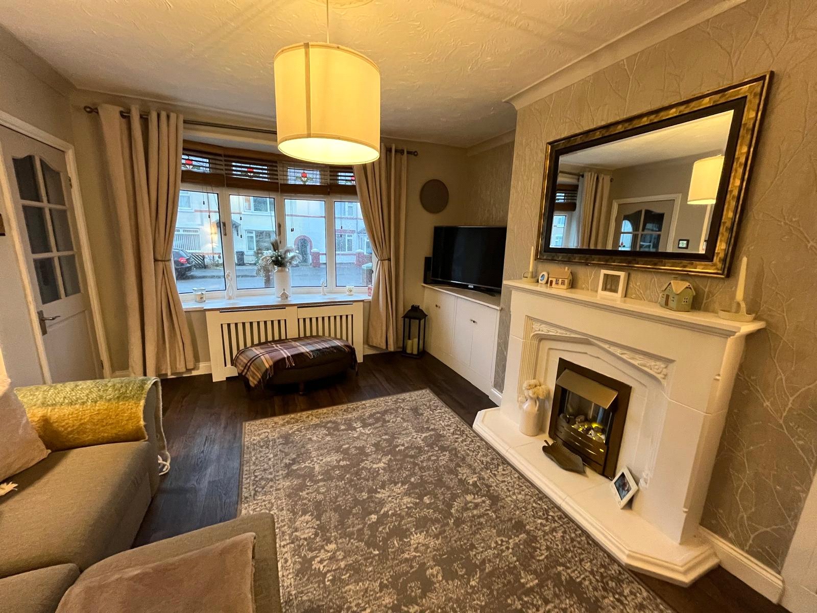 4-part Double-glazed bow window, feature fire breast with inset electric fire and decorative wooden surround, built-in alcove cupboards to both sides, radiator with decorative cover, vinyl flooring.