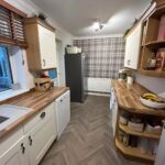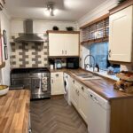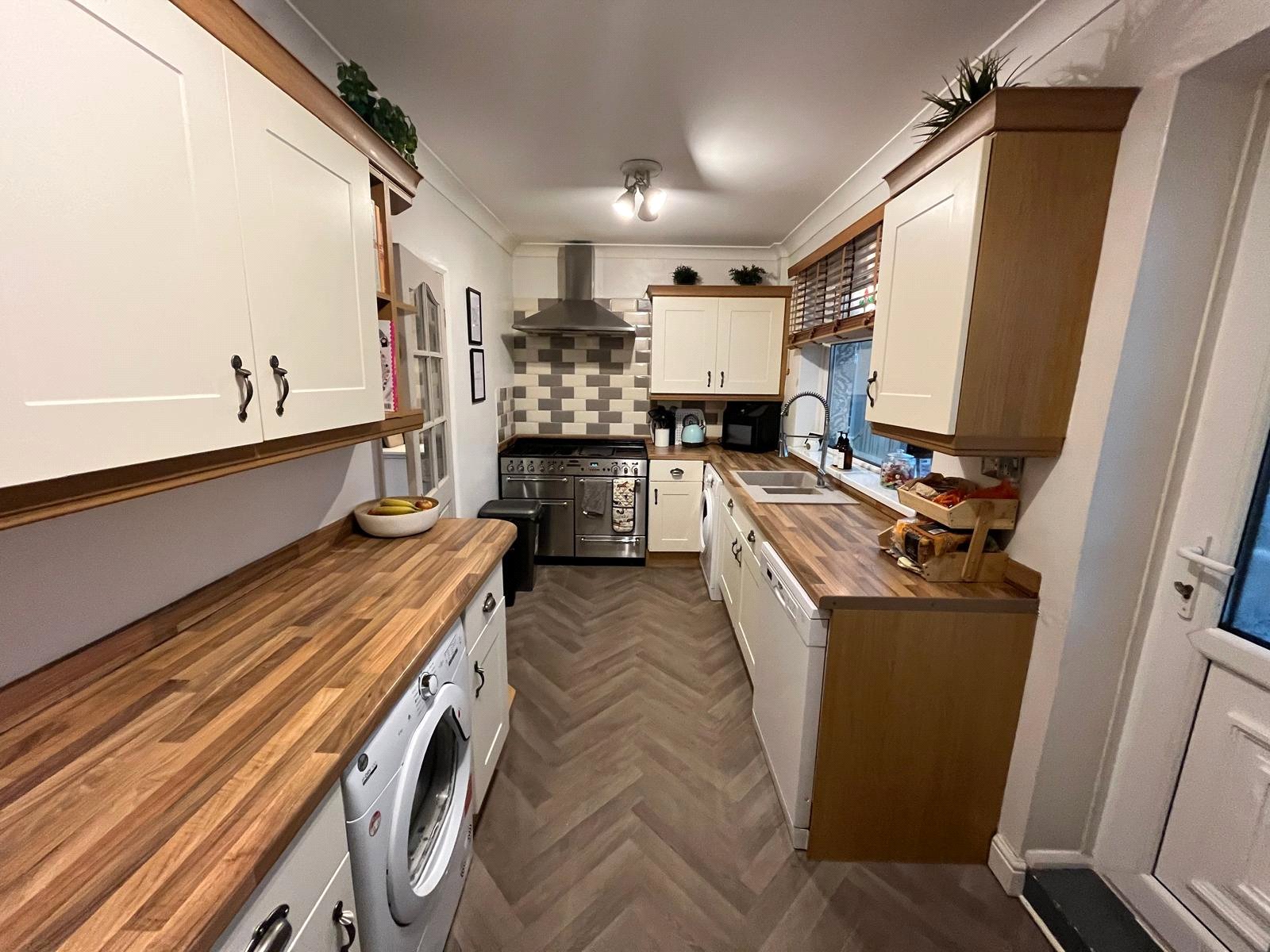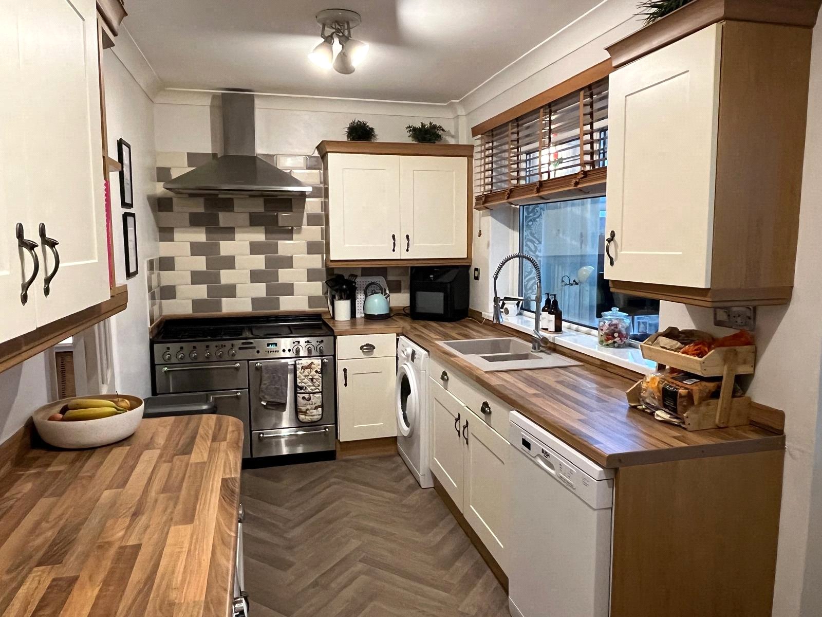 Double-glazed window and door to conservatory, full range of fitted base and wall units, 1100mm dual fuel range cooker, composite sink, American fridge/freezer, space for washing machine, dryer and dishwasher, under-stairs storage cupboard, vinyl flooring, tiled splashback, radiator.