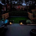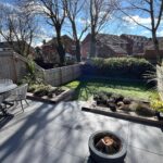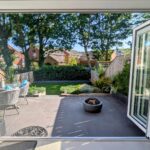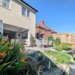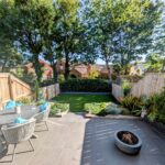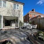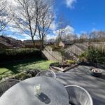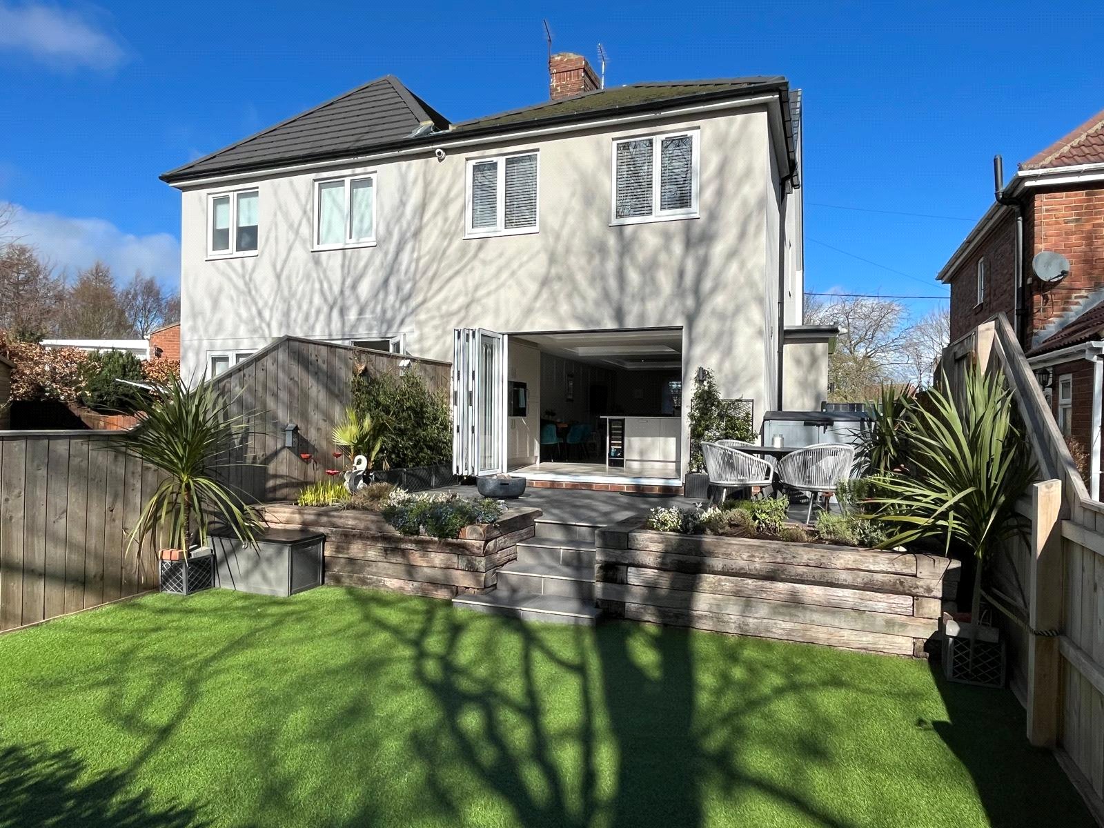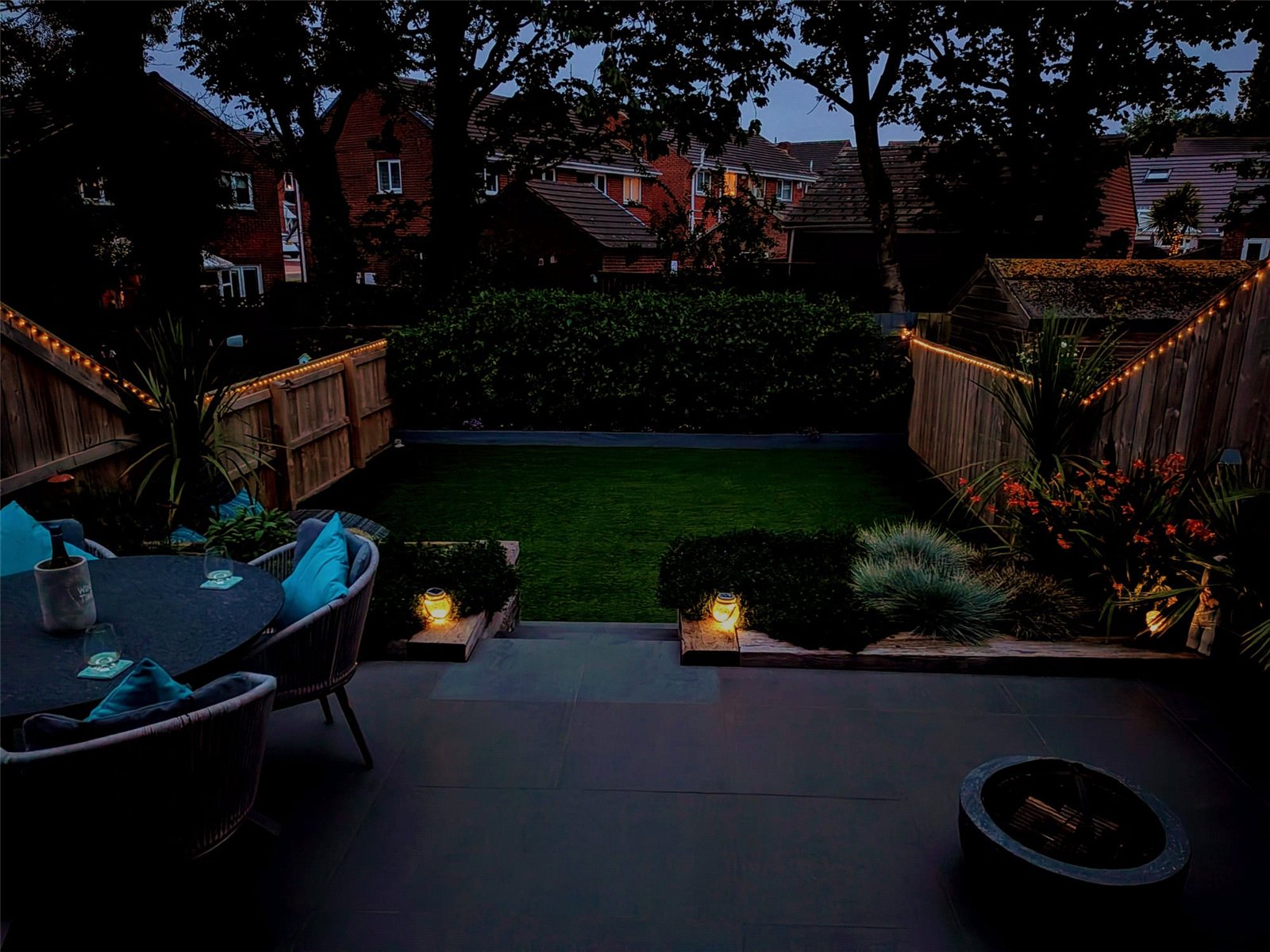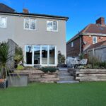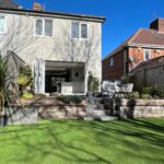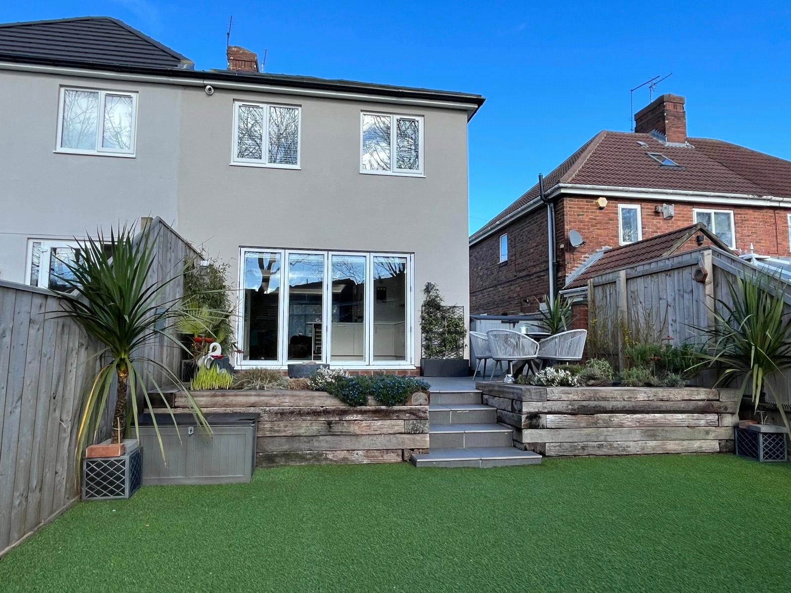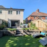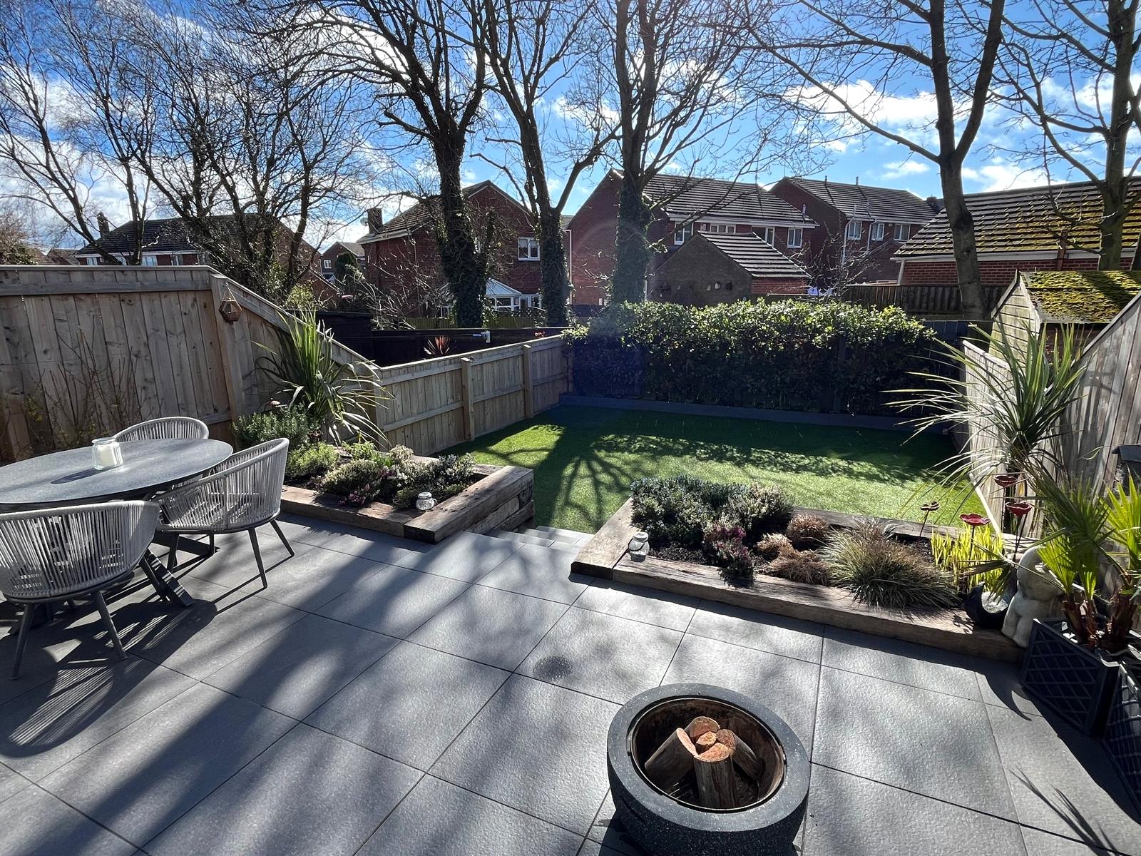Raised tiled patio area, railway sleeper retaining wall, steps to astro turfed lawned area.