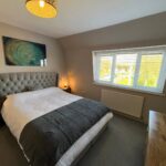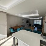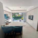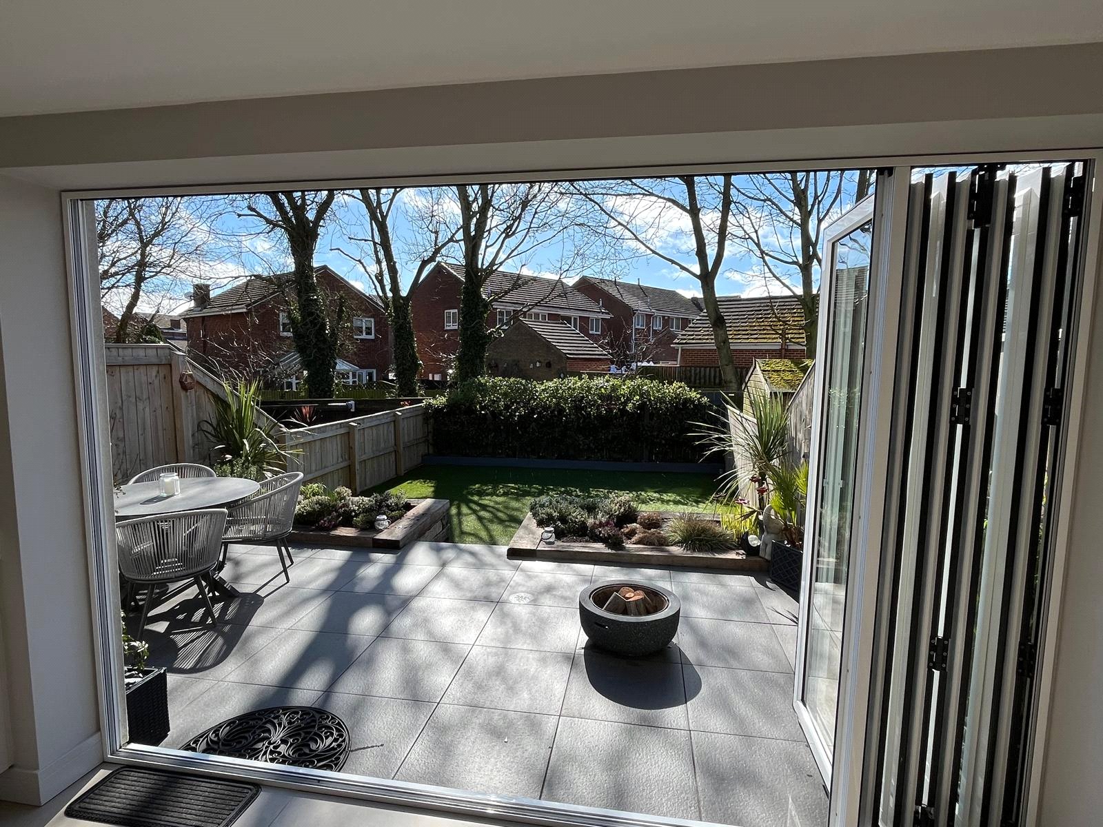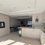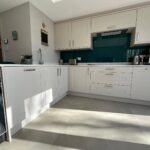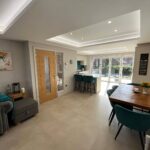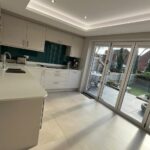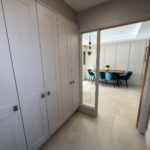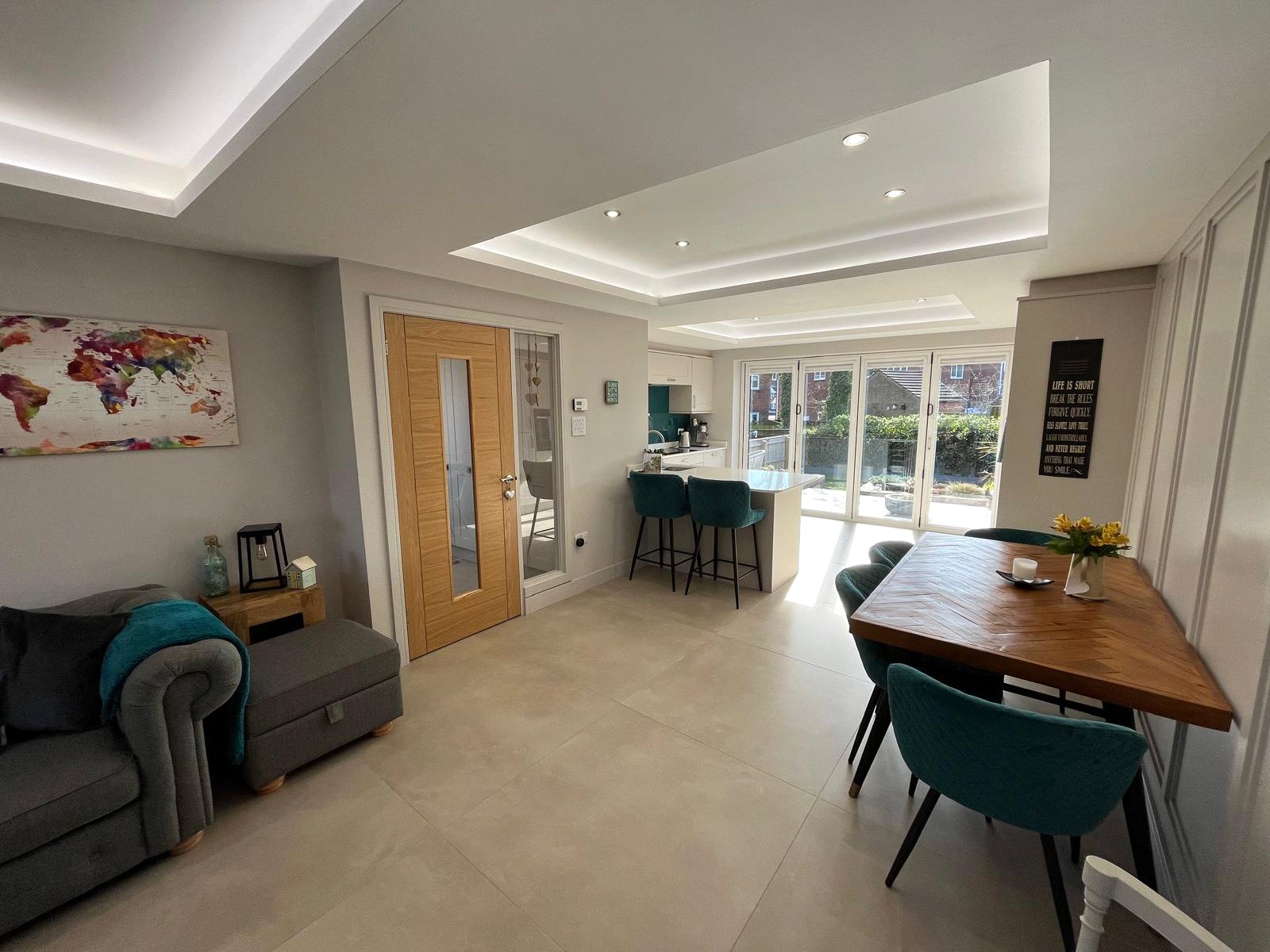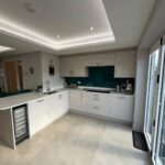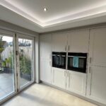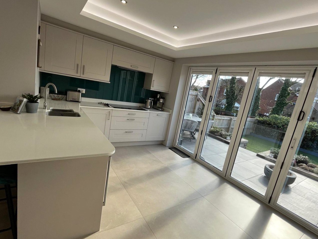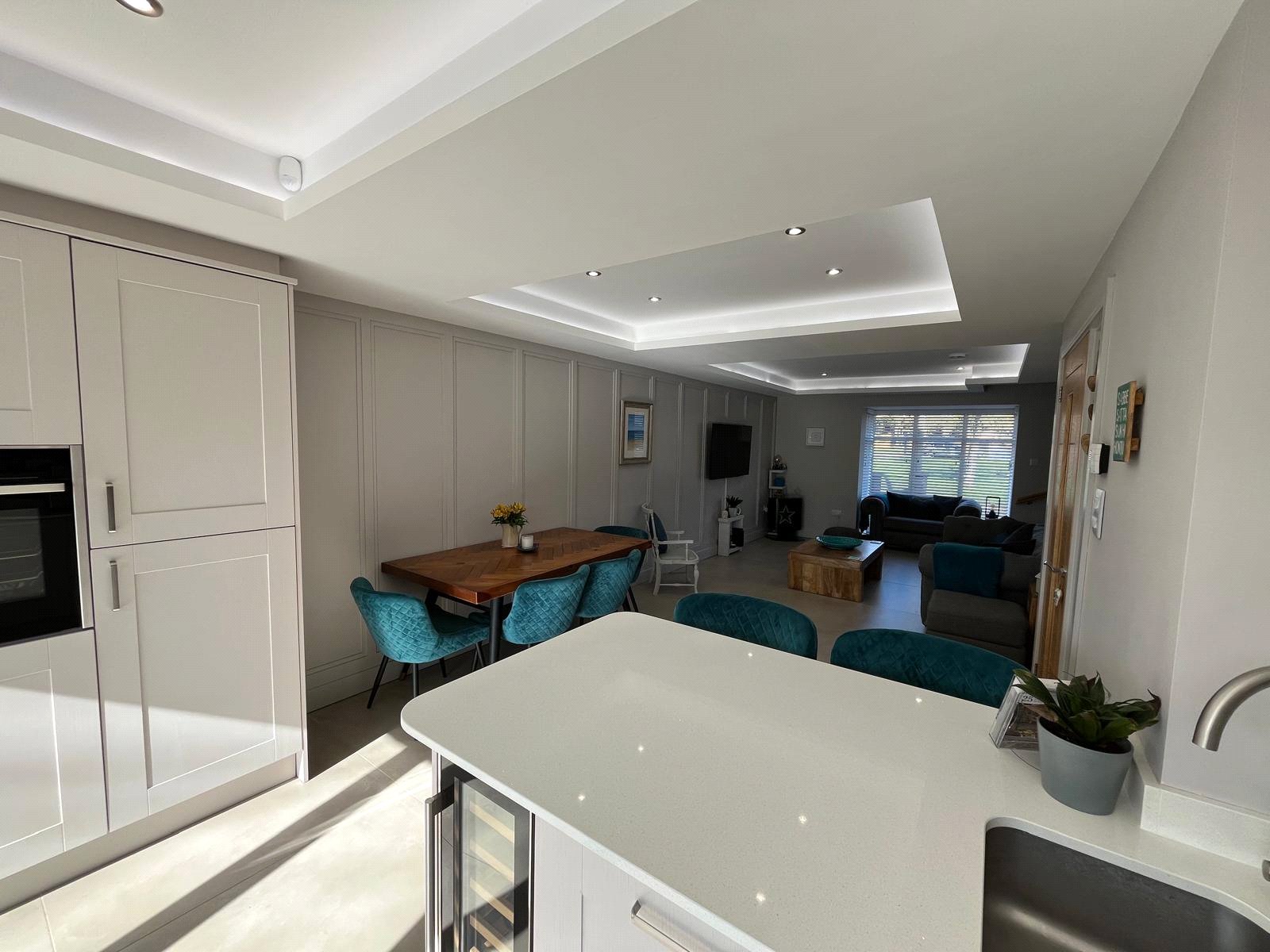 4 Panel Bifold double-glazed doors, full range of base and wall units including full wall of tall larder units, 2 electric ovens, induction hob, extractor, integrated fridge/freezer, integrated dish washer, integrated slim-line wine cooler, integrated pull out bin, Quartz work surfaces with under-mounted stainless-steel sink, Island breakfast bar with seating for 2, tiled flooring with under floor heating, recessed ceiling with spotlights.