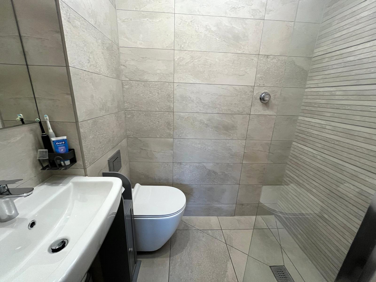 Wet room shower area with full height screen, rainfall shower head and additional hand-held head, fully tiled walls, tiled flooring with under floor heating, back to wall w/c with concealed cistern, hand basin with mixer tap, recessed ceiling with spotlights.