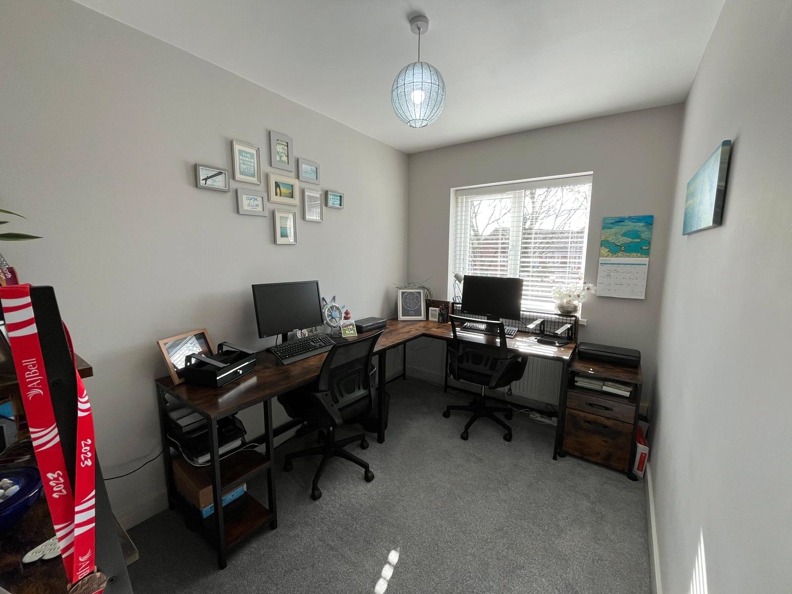 Double-glazed window with louver blinds, bulk-head storage cupboard, radiator, carpet.