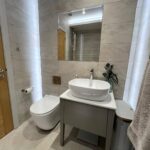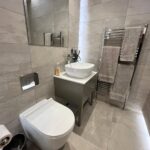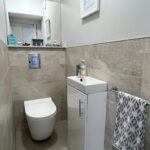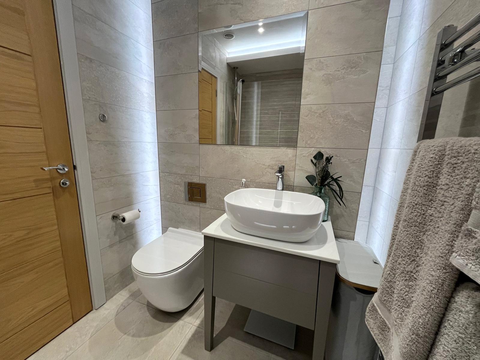 Back to wall w/c with concealed cistern, designer hand basin with mixer tap and vanity unit, half tiled walls, tiled flooring with under floor heating.