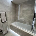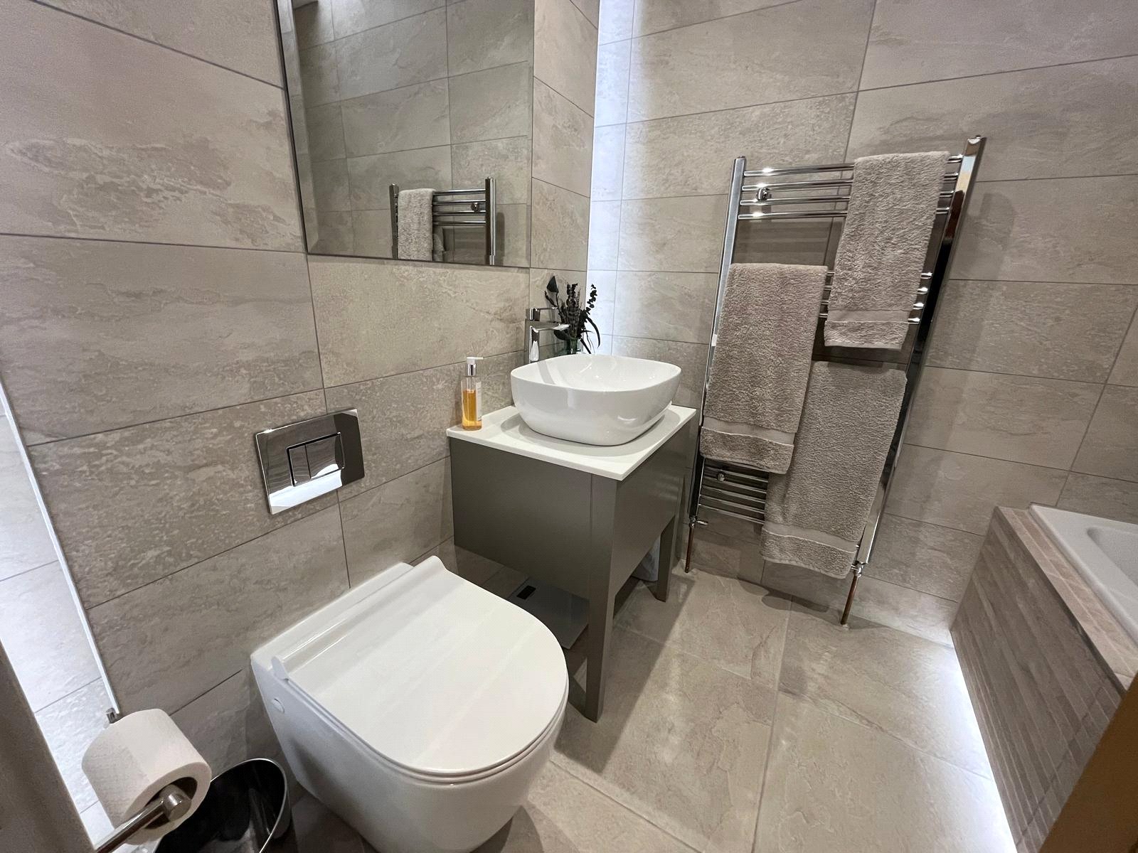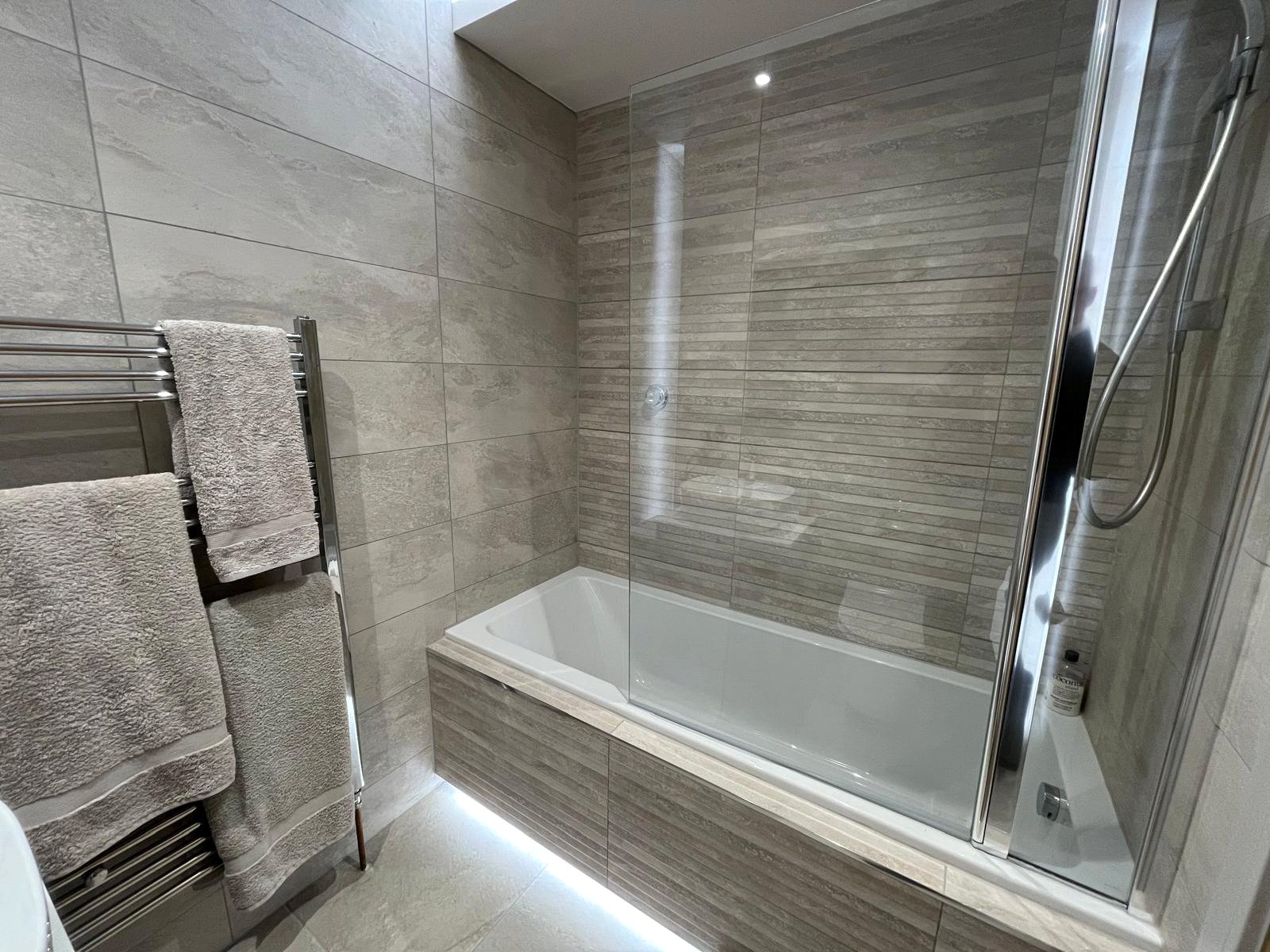 Panelled bath with screen and bar shower, back to wall w/c with concealed cistern, designer hand basin with mixer tap and vanity unit, extractor, fully tiled walls, tiled flooring with under floor heating.