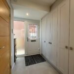 Composite entrance door, glazed side panels, full wall of fitted storage cupboards including 1 housing a washer and dryer, tiled floor with under-floor heating, spotlights.