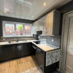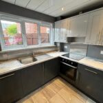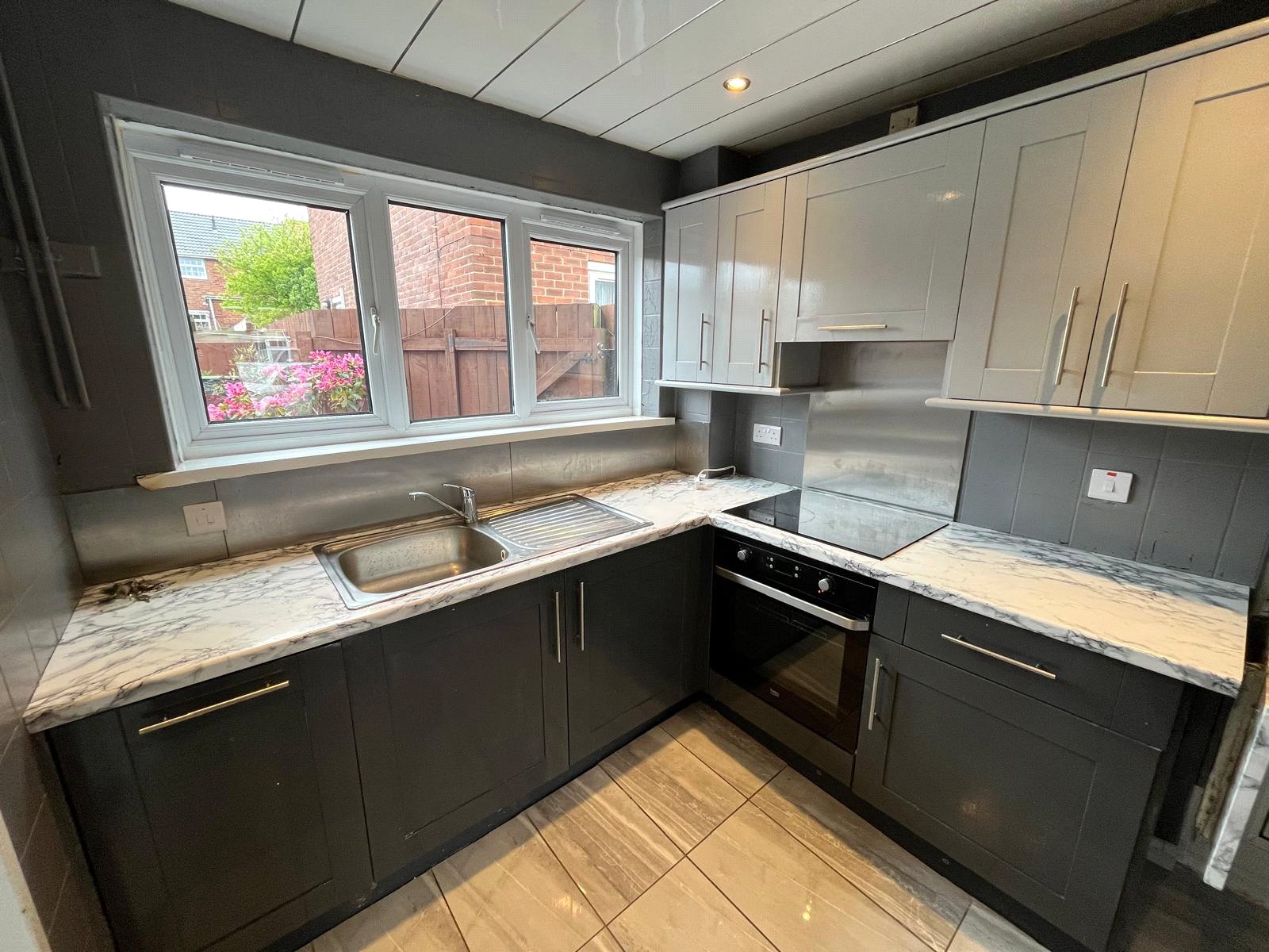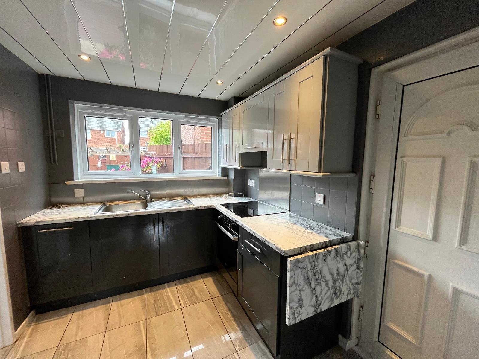 Double-glazed window and door to side, full range of base and wall units, electric oven, electric hob, extractor, integrated slim-line dishwasher, under stair storage cupboard, panelled ceiling with spotlights, fully tiled walls, tiled floor, radiator.