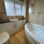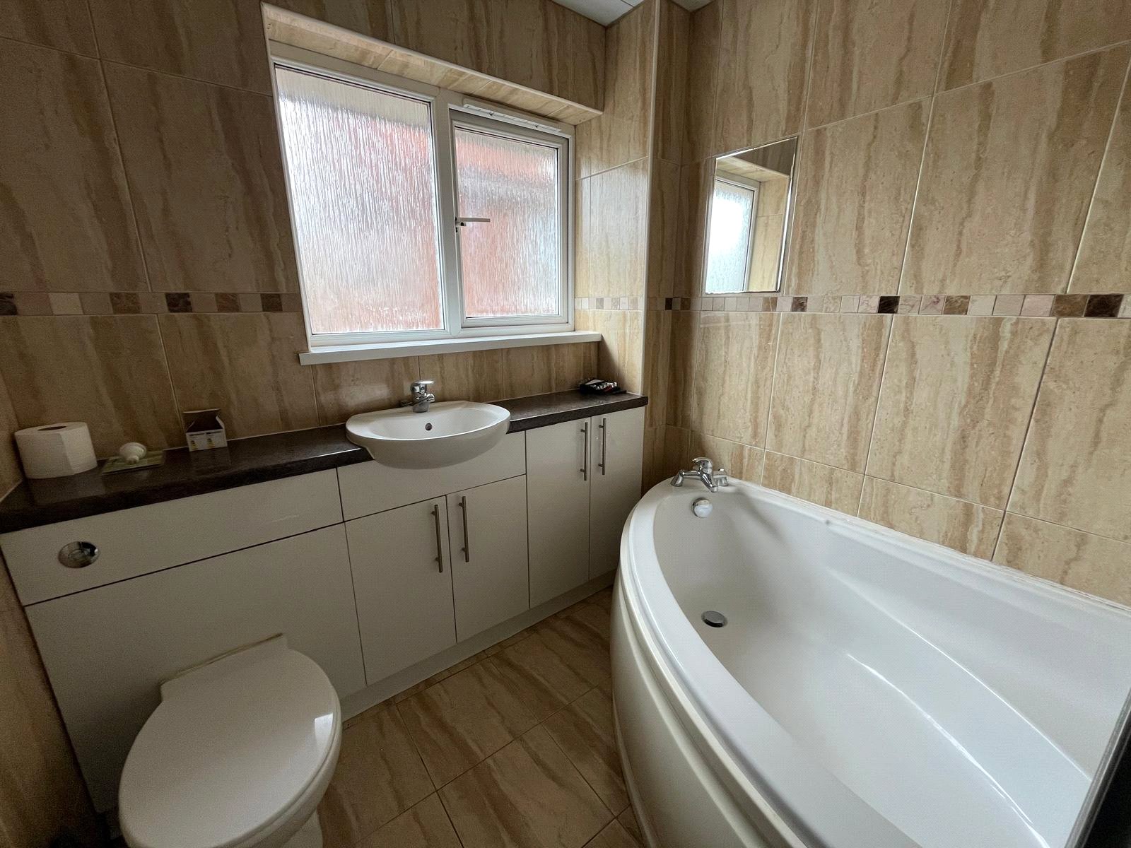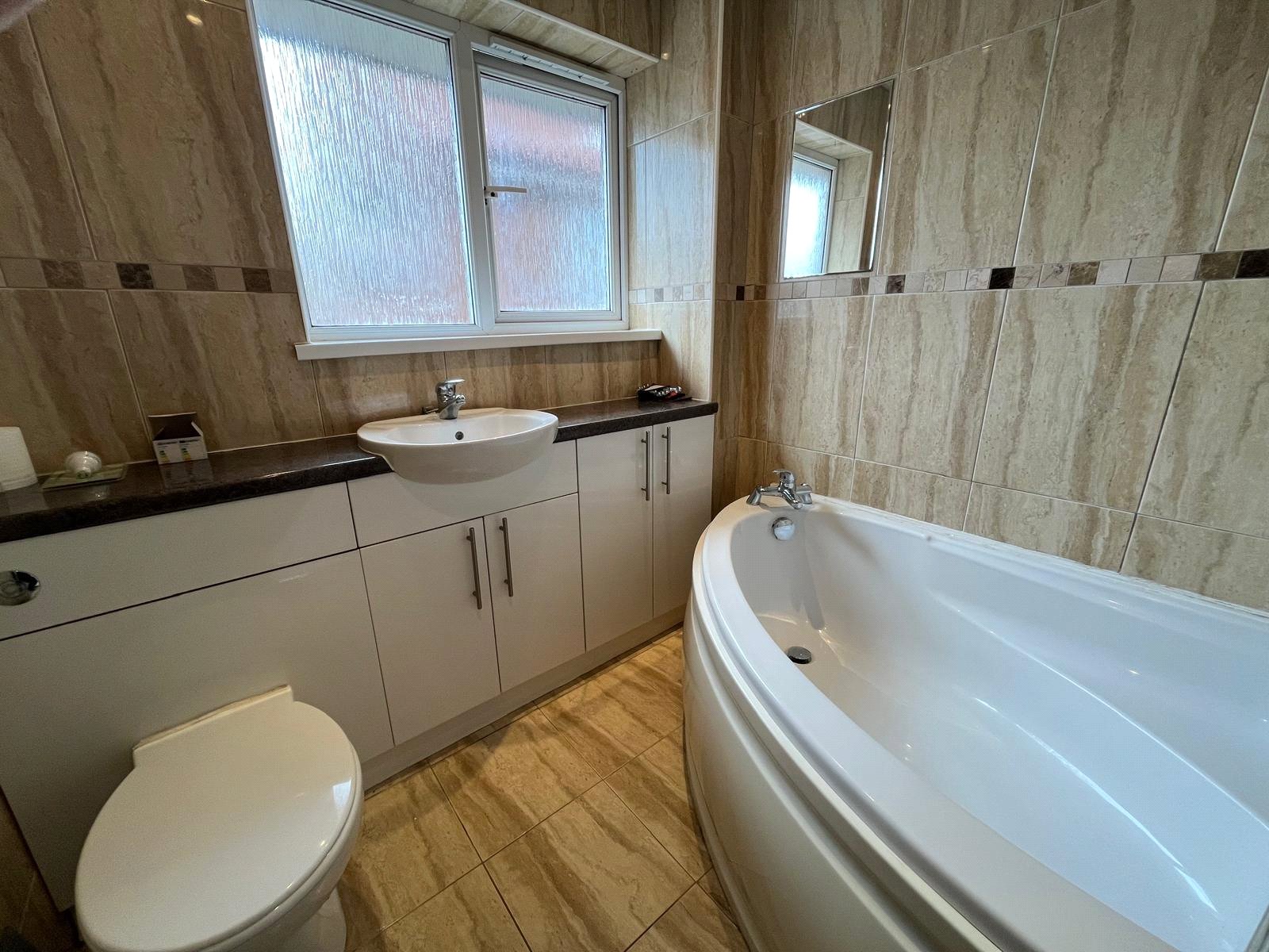 Double-glazed window, panelled bath with screen and bar shower, full wall of vanity units with back to wall w/c and hand basin, tiled floor, panelled ceiling, spotlights.