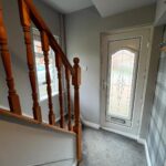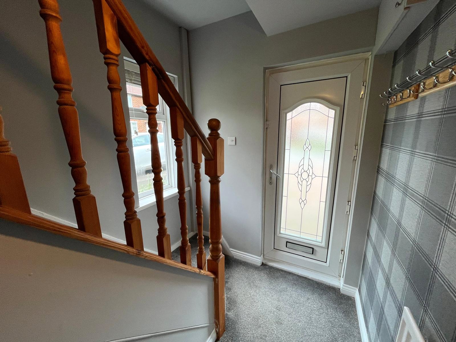Double-glazed window and door, open stairs, under stair cupboard, radiator, carpet.
