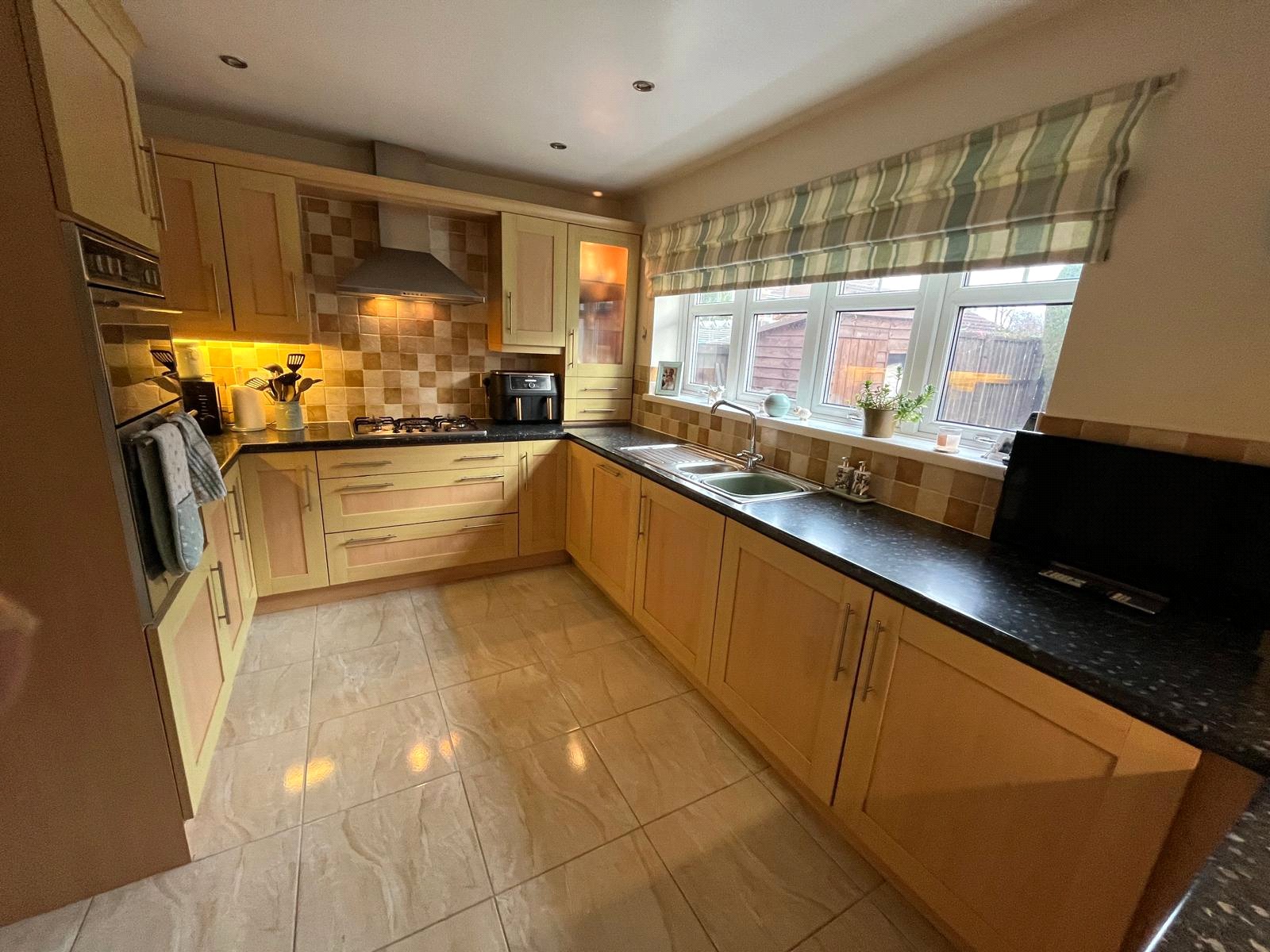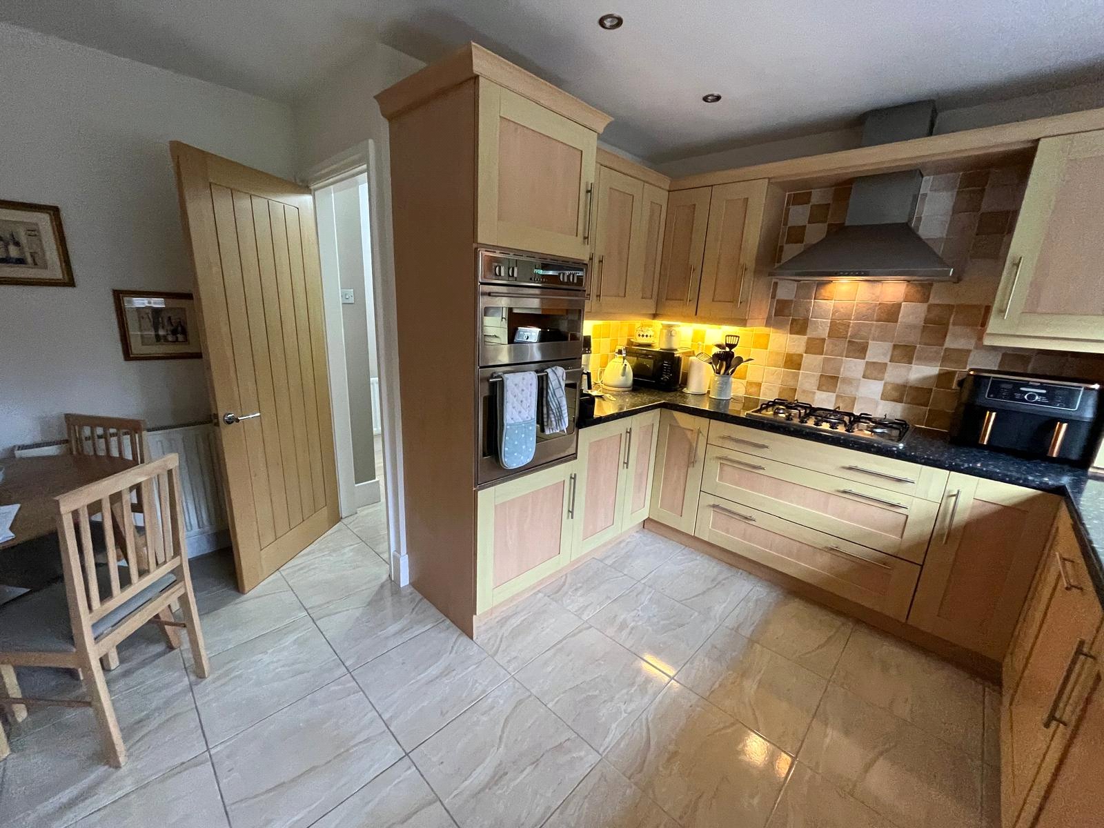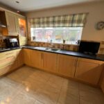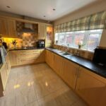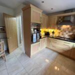 Double-glazed window, full range of fitted base and wall units, electric double-oven, 5 burner gas hob, chrome chimney extractor, integrated fridge, integrated freezer, integrated dish washer, tiled floor, tiled splash back, radiator.