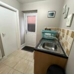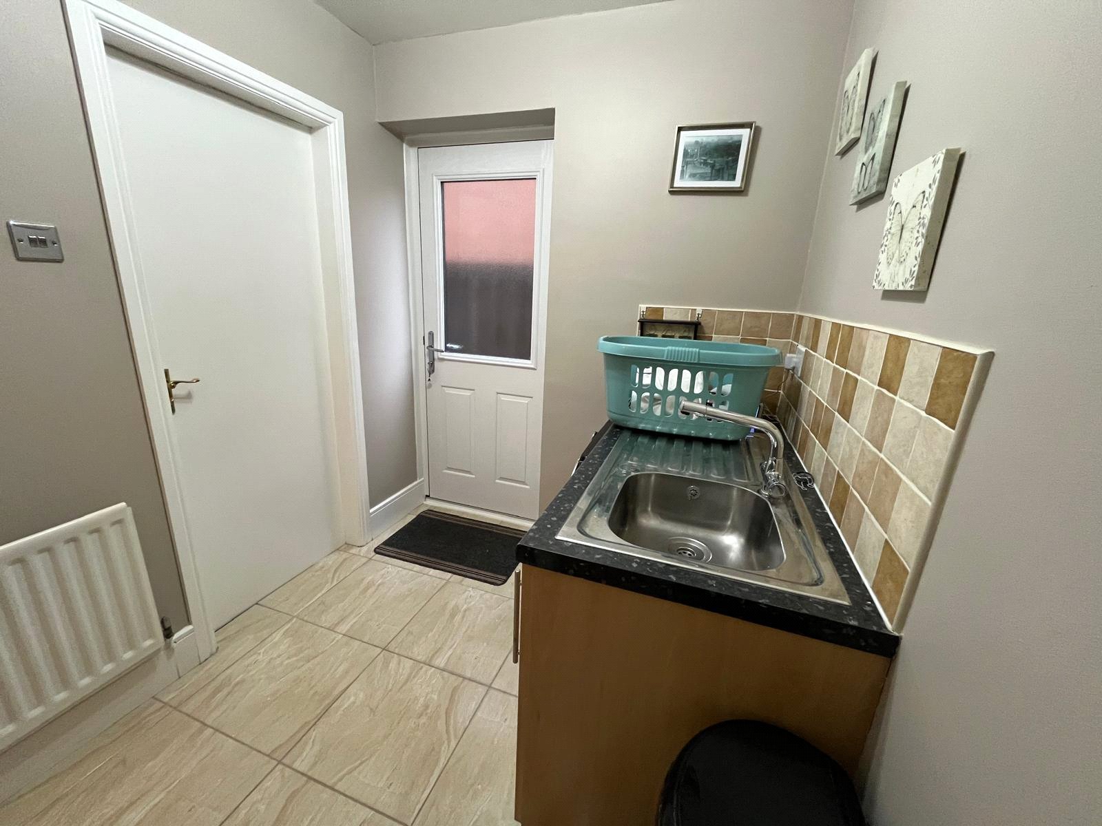 Composite door leading to side of property, base unit with worktop, stainless steel sink, plumbed for washing machine, tiled floor, tiled splash back, door to garage.