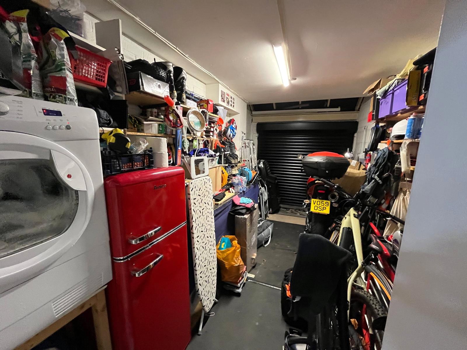 Remote controlled garage door, electric sockets and lighting.