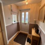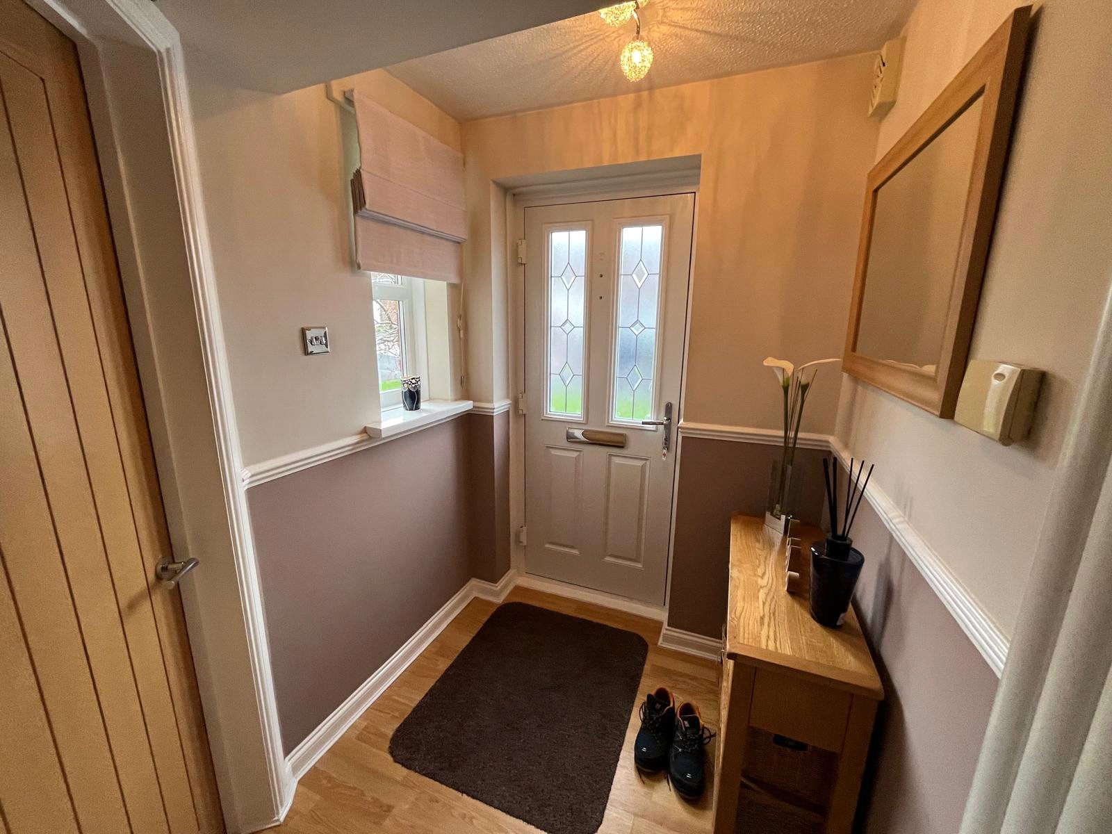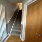 Composite entrance door, tall designer radiator, laminate flooring, stairs with carpet.