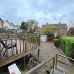 Raised decking, gravelled area with mature trees/bushes, shed. Air source heat pump.