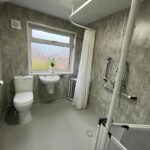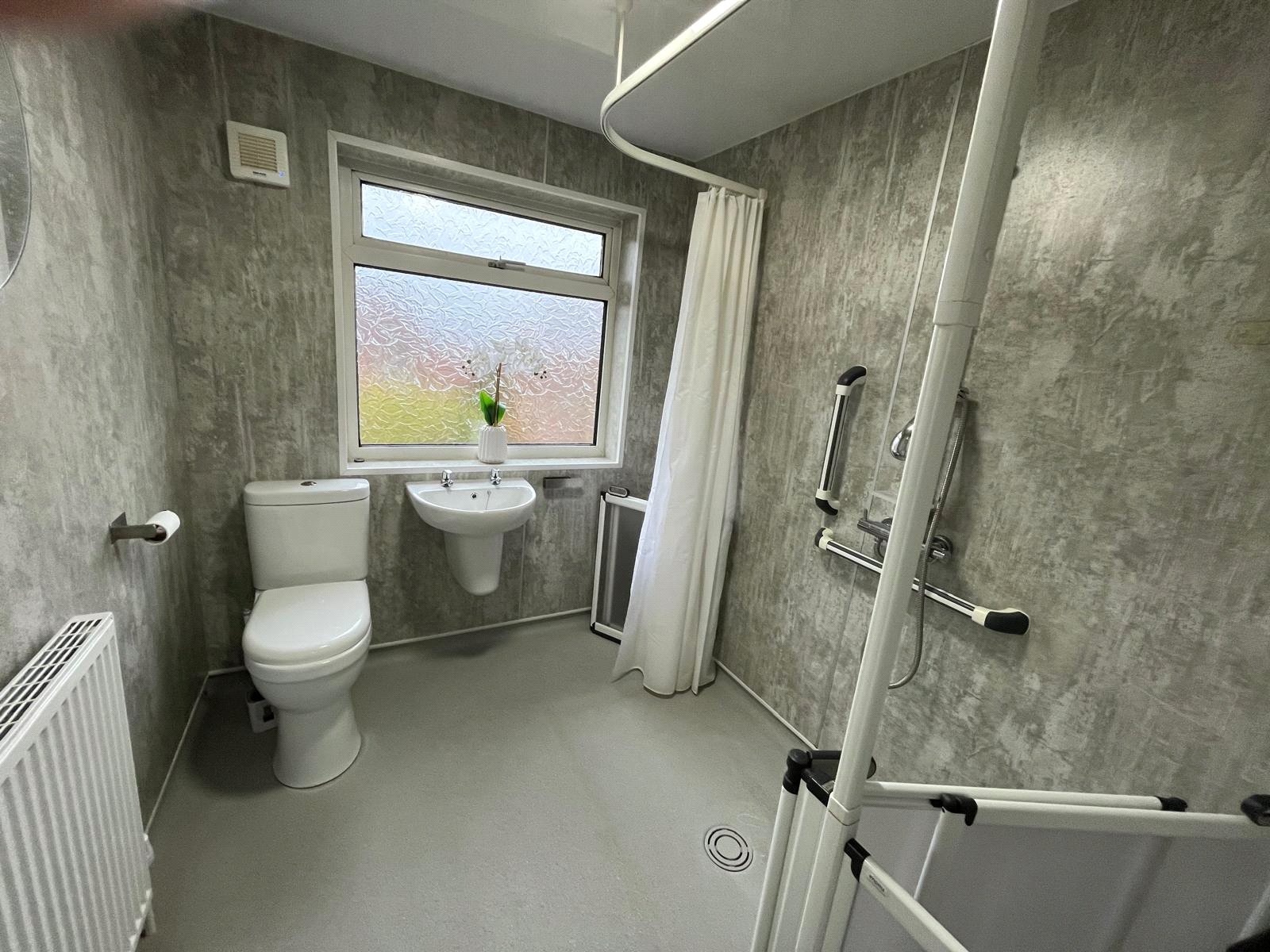 Double-glazed window, wet room flooring with bar shower and screen, fully panelled walls, w/c, hand basin, extractor light,