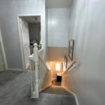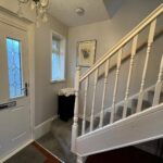 Composite entrance door and window, open plan stairs, under stair storage cupboard housing fuse board, laminate flooring.