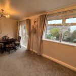 Double-glazed window and French doors leading to raised decking area, double and single built-in storage cupboards, carpet, radiator.