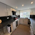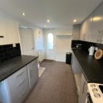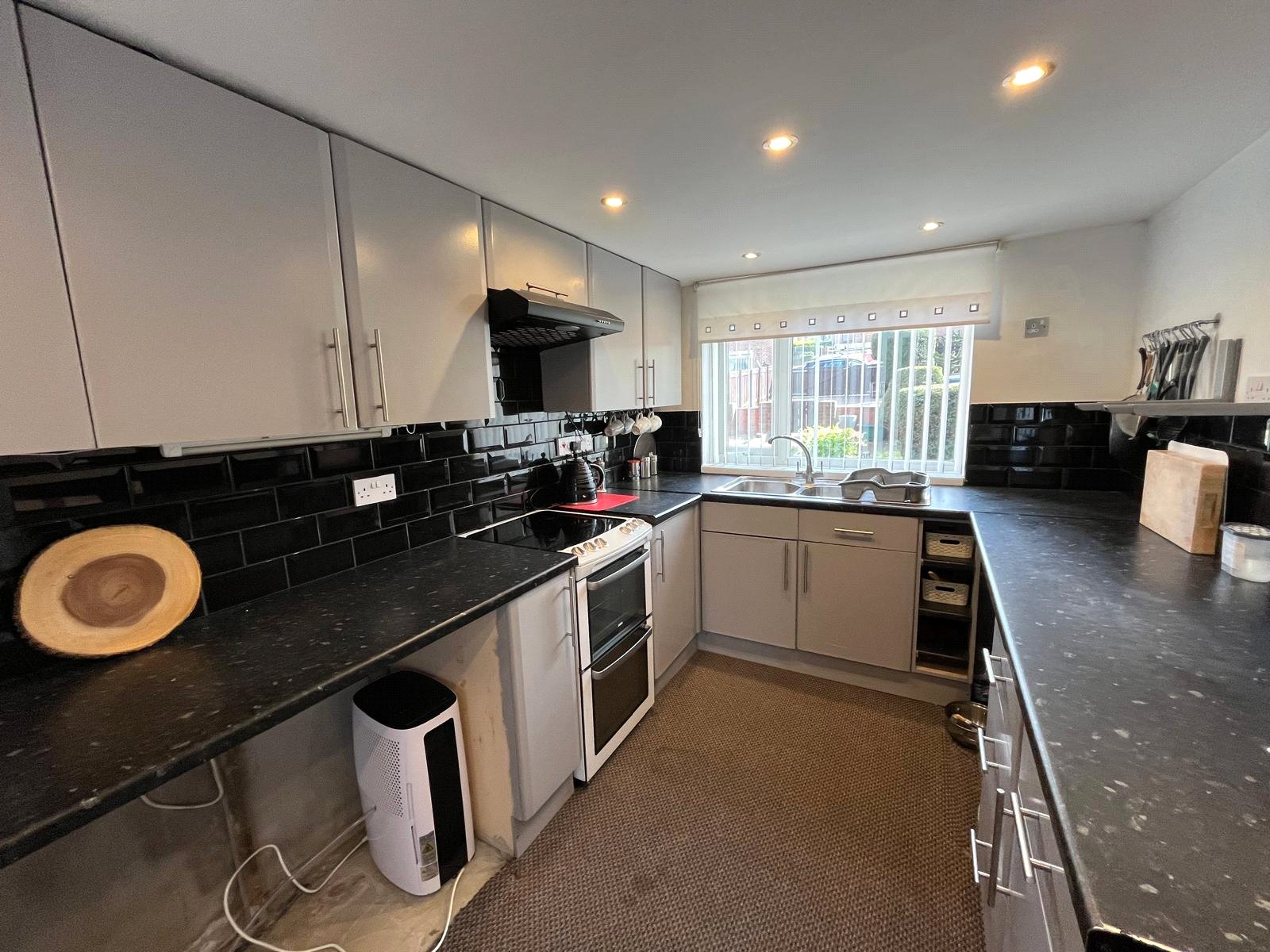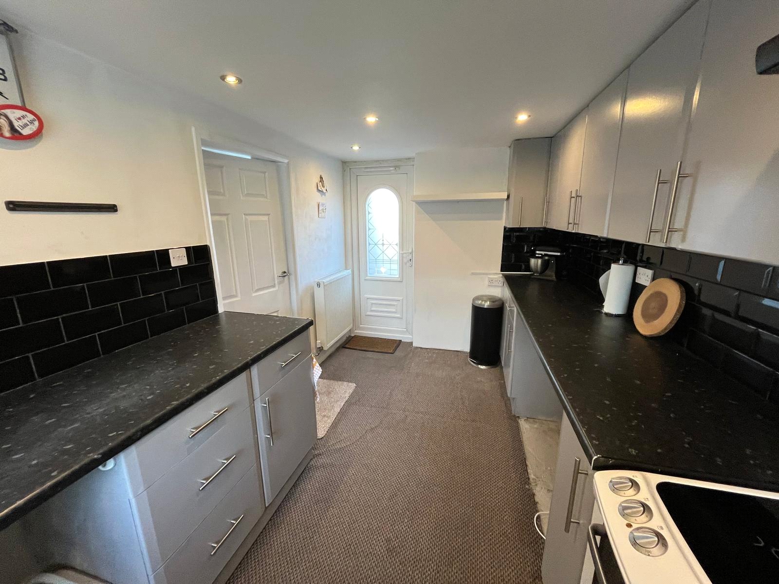 Double-glazed window to front, door to rear, full range of base and wall units, space for free-standing cooker, space for fridge and freezer, space for washing machine, tiled splashback, spotlights, radiator, carpet.
