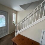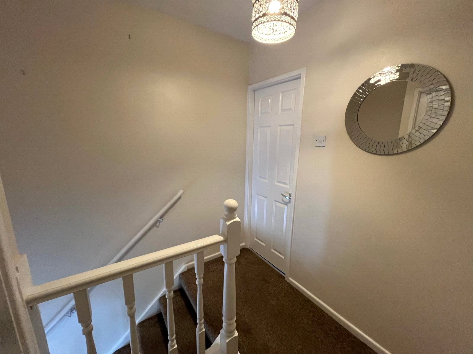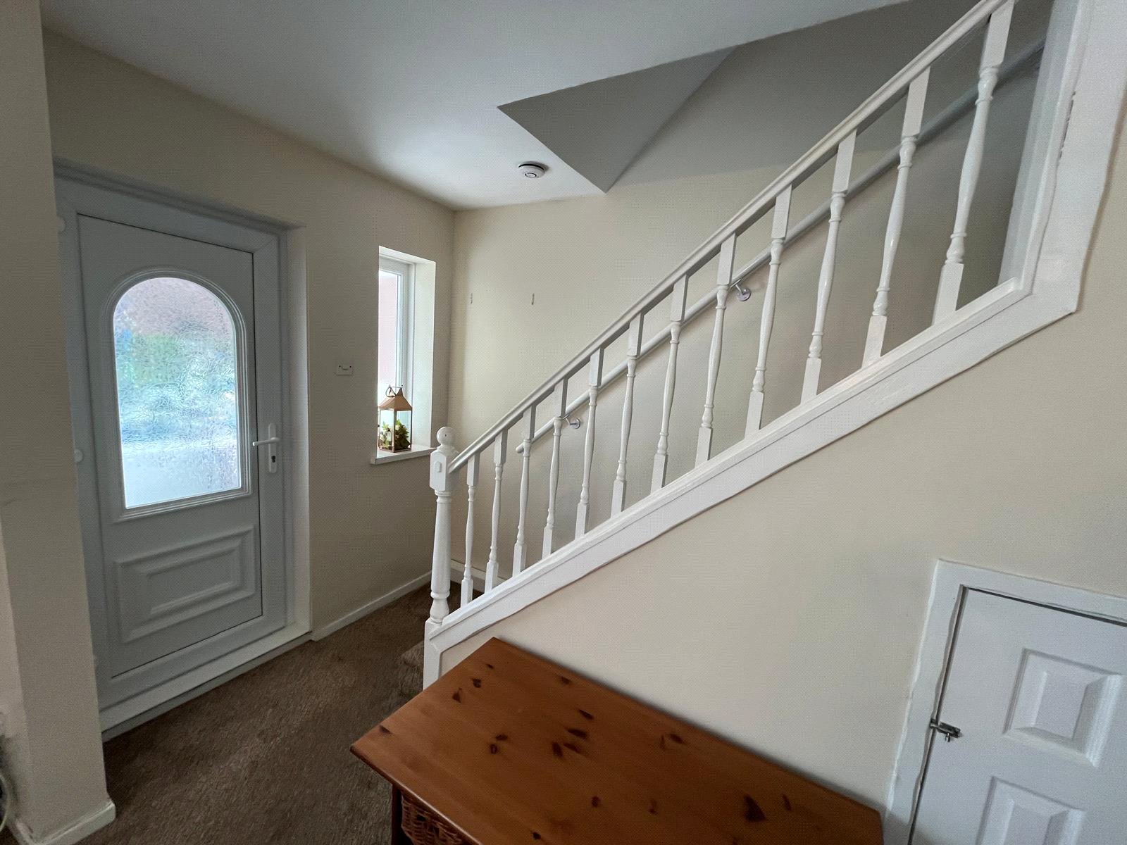 Double-glazed window, open stairs, understairs storage cupboard, electric fire, radiator, carpet.