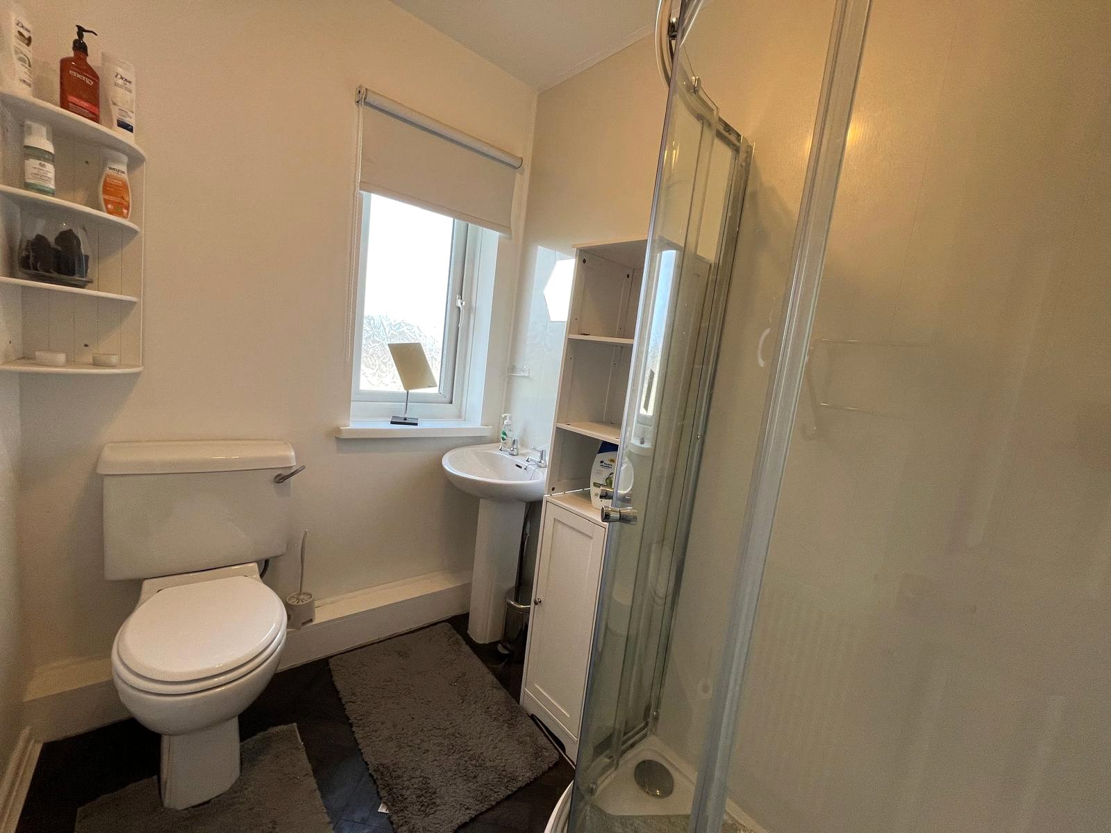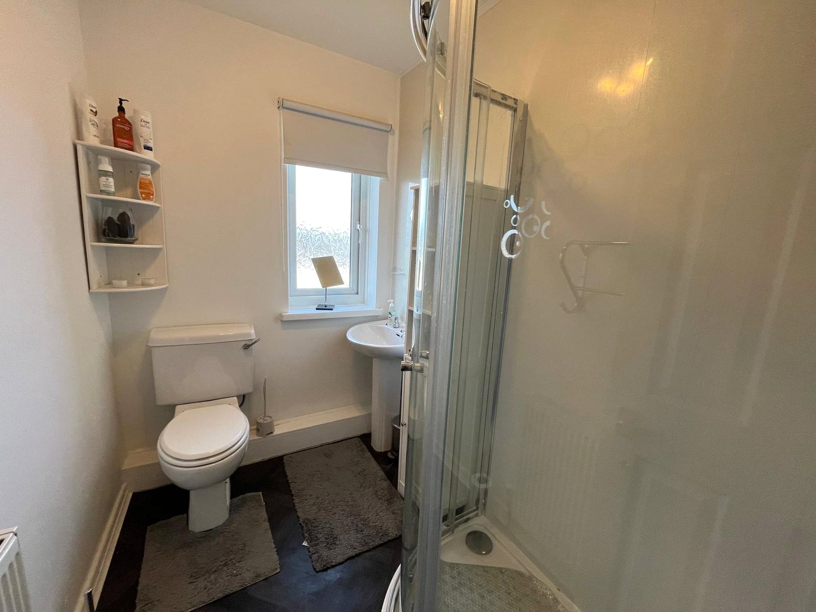 Double-glazed window, corner shower cubicle with bar shower, w/c, hand basin, radiator, part panelled walls, vinyl flooring.