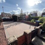 Double gates, double width block paved driveway, lawn, mature borders, Willow and Monkey trees.